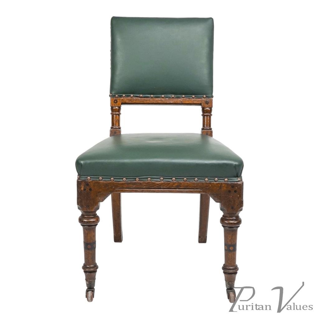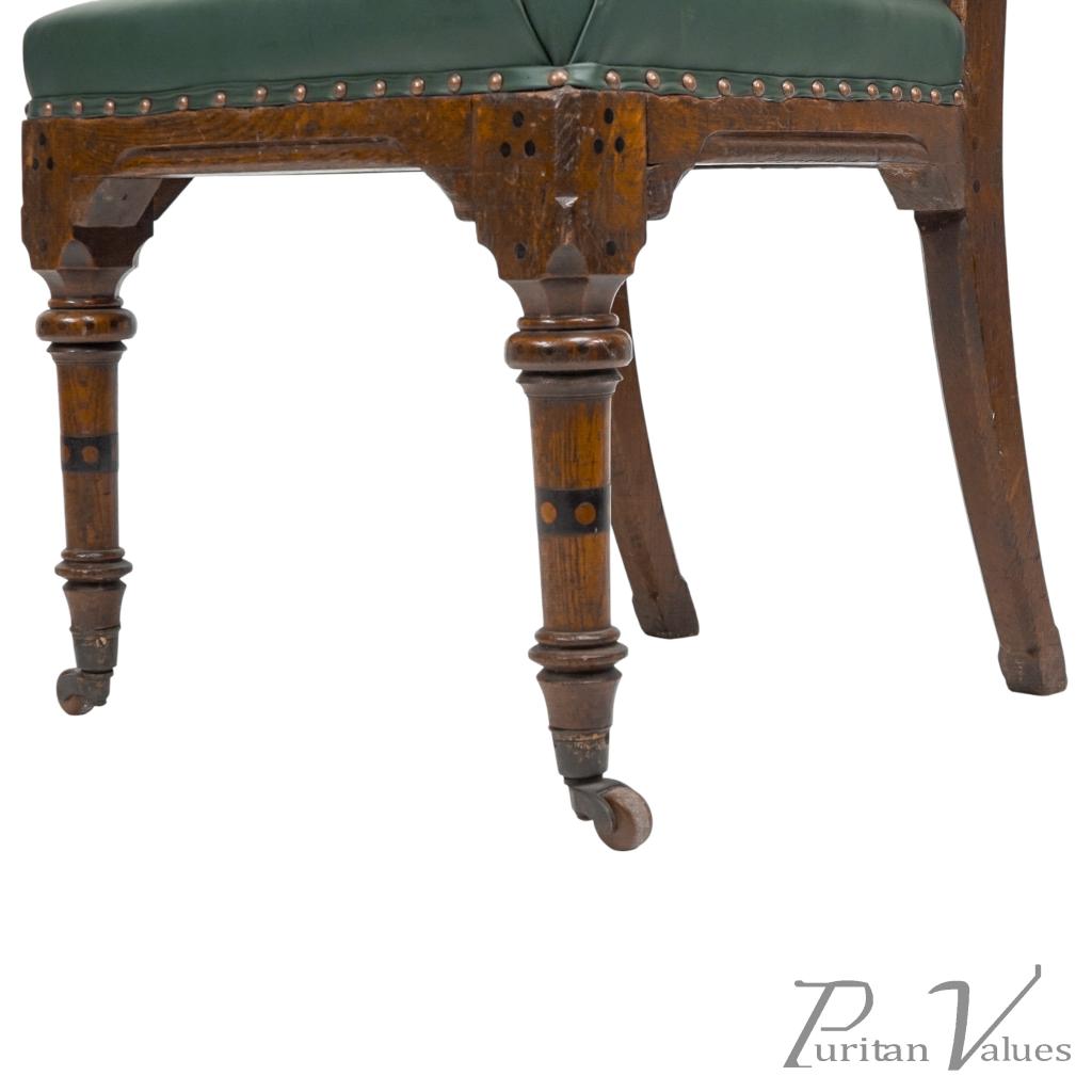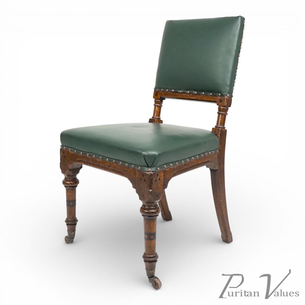 A Gothic Revival side chair with chamfered edges, and ebonized dot decoration to the lower back, and to the front and back seat corners. With ring turned supports below the upholstered back and nice scroll details around the sides beneath the seat. The ring turned legs with an inlaid band peppered with further ebonized dot decoration stood on the original brass and ceramic castors to the feet. The back legs have stop and start chamfered details.