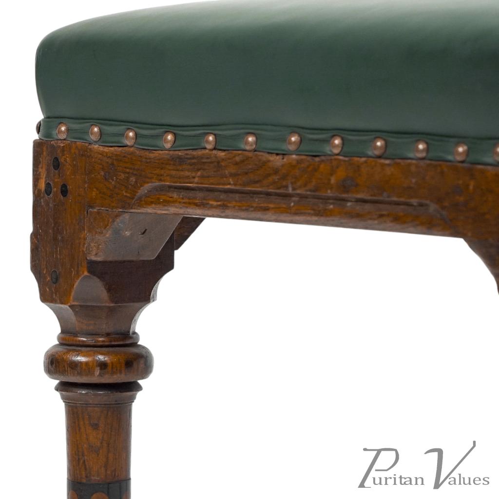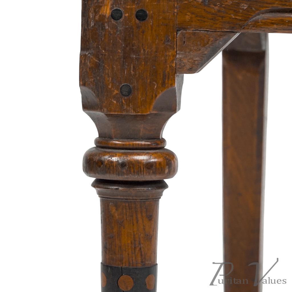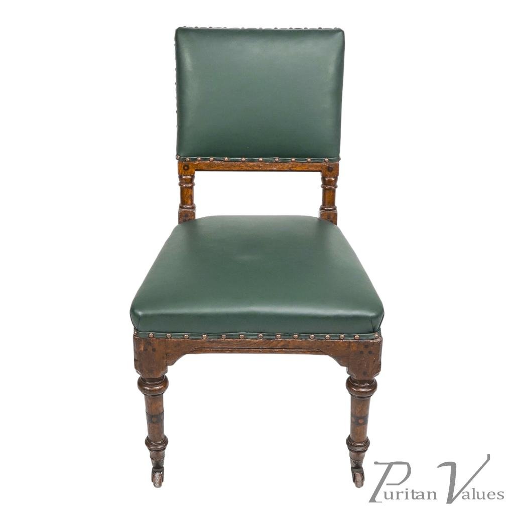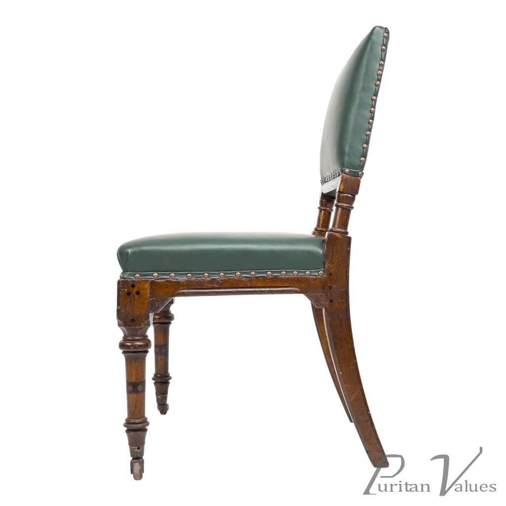 A Gothic Revival side chair with chamfered edges, and ebonized dot decoration to the lower back, and to the front and back seat corners. With ring turned supports below the upholstered back and nice scroll details around the sides beneath the seat. The ring turned legs with an inlaid band peppered with further ebonized dot decoration stood on the original brass and ceramic castors to the feet. The back legs have stop and start chamfered details.