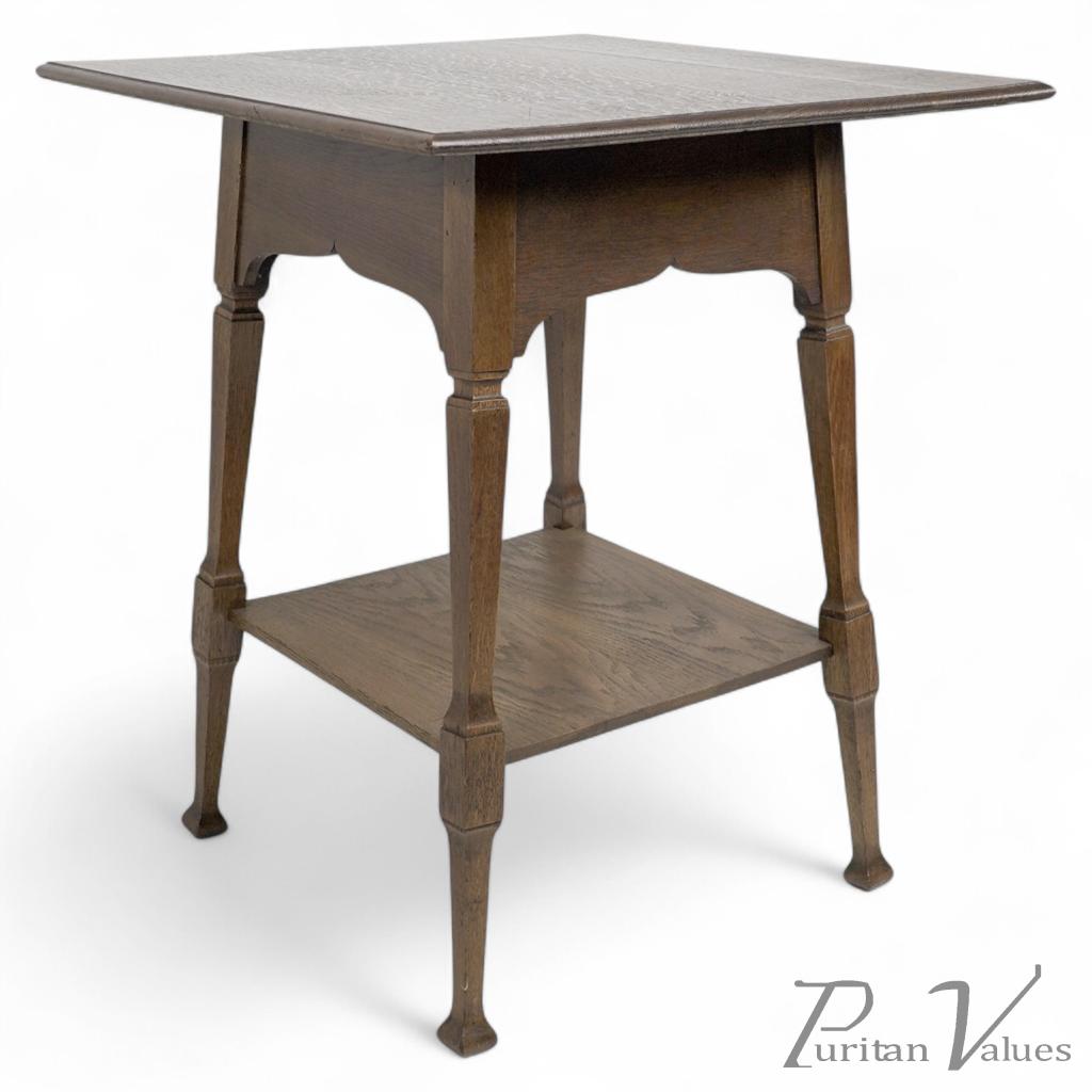 Side table in oak, aligned to the Arts and Crafts Movement, c.1890. A refined two-tier arrangement with a square lower shelf and a shaped Moorish apron tucked beneath the top. Turned supports lift the composition, the slight splay and chamfering keeping the form visually light while remaining practical for everyday use. The square plan makes it adaptable as an occasional table, lamp stand or bedside.