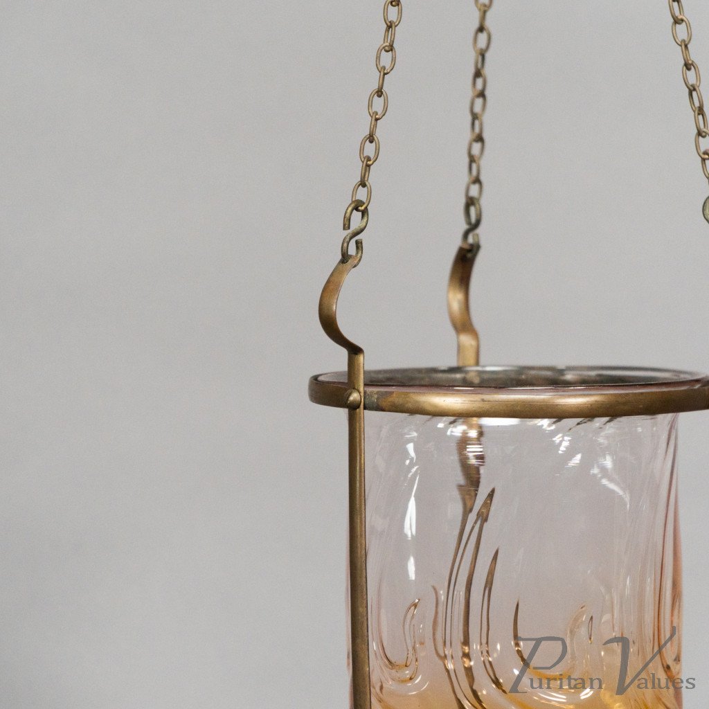 with subtle bronze-tinged shade and whiplash swirl blown into the glass liner. Height of the lantern 10", the height of the chain which can be adjusted 15".