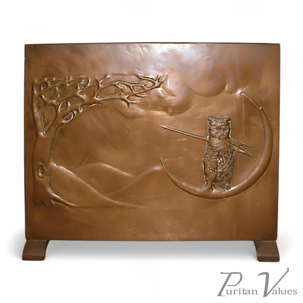 A Copper Fire Screen with an Owl Standing on the Crescent Moon Beside a Stylised Tree