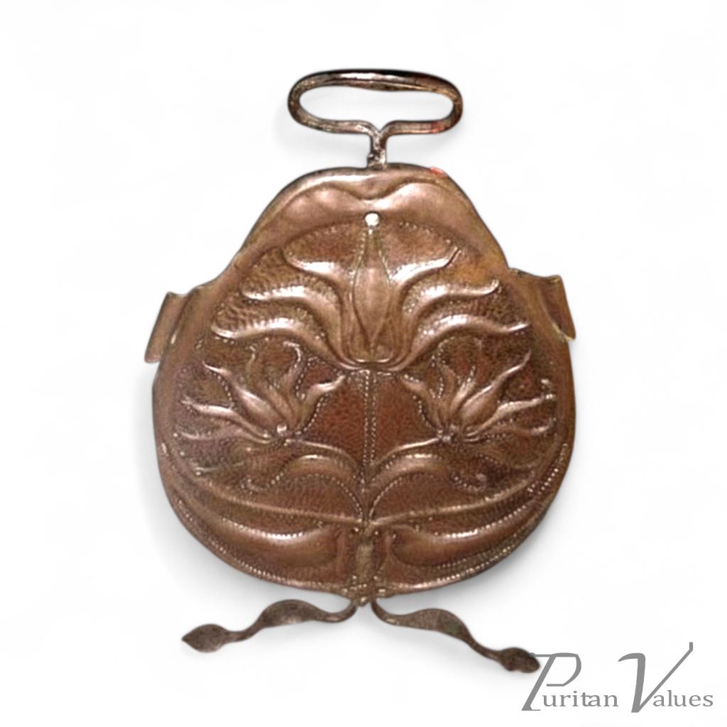With stylised floral repousse detail and hand wrought frame on tripod base. Length 18", height 29", depth of feet 9 1/2". Circa 1900.