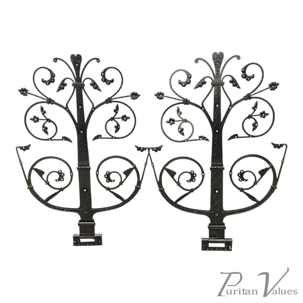 A good pair of large Gothic Revival door hinges with incised decorative and floral details. They have been bead blasted and then powder painted in black enamel for outside use.