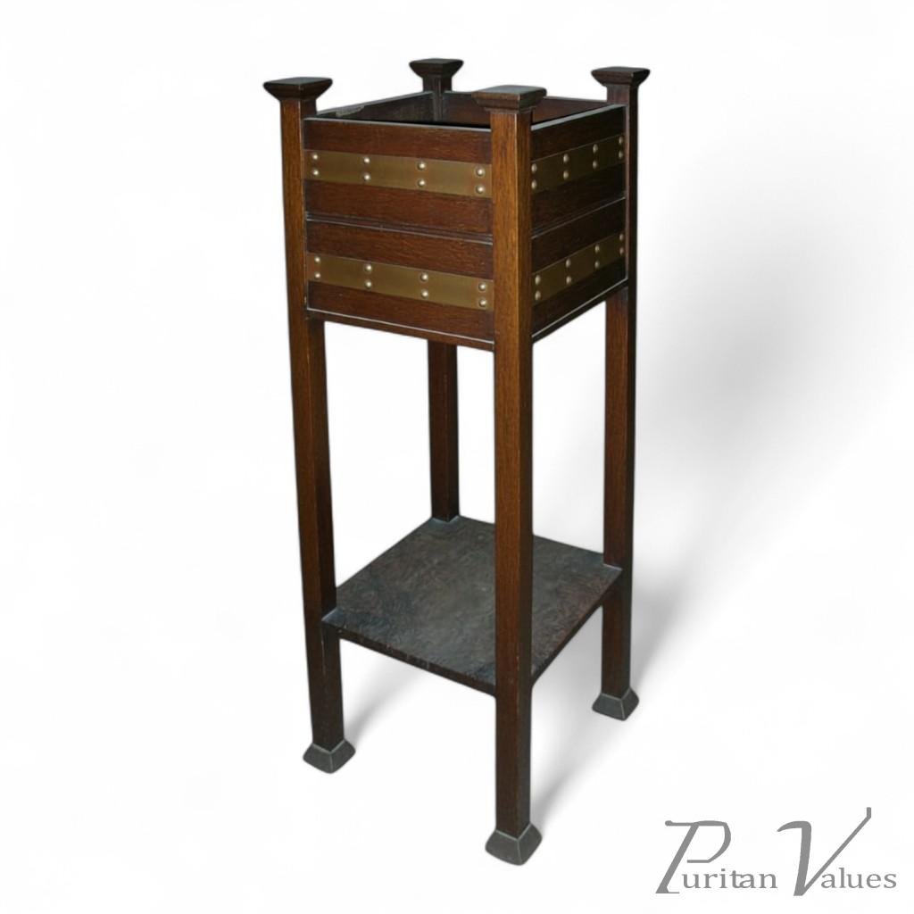 An oak plant stand dating to c.1900, designed in the Arts and Crafts Movement style. The tall square frame is constructed in solid oak with copper banding secured by hand-riveted studs, highlighting the material honesty central to the movement’s ideals. The upper section forms a deep planter box above a practical lower shelf, unified by clean vertical lines and simple structural symmetry. The contrast between the warm oak grain and the aged copper detailing gives the piece both visual richness and architectural presence.