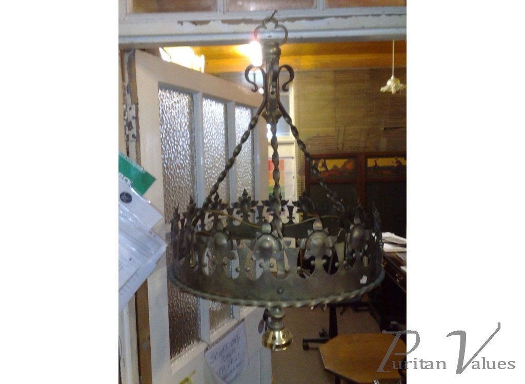The chandelier is constructed in solid brass, comprising a circular band pierced with alternating trefoil and fleur-de-lis motifs. The upper section rises through twisted brass supports to a shaped finial with scroll details, while the lower edge terminates in a turned pendant knop.