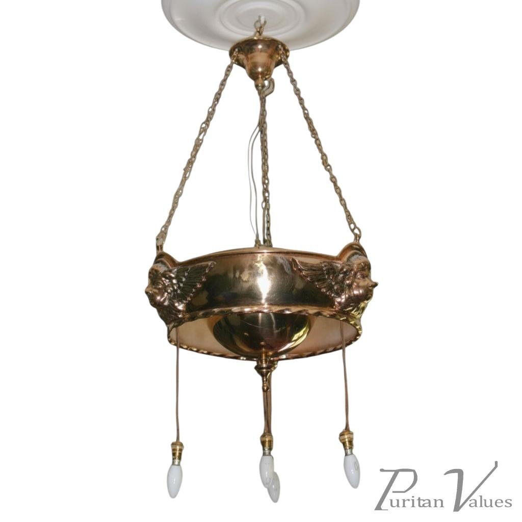 A Good Quality Pair of Glasgow School Brass Ceiling Lights with Winged Angels Faces