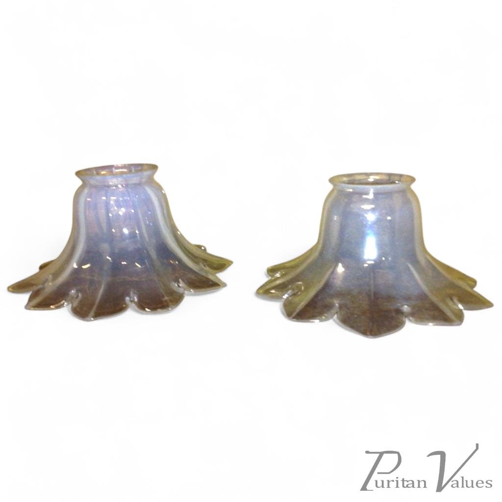This pair of Vaseline glass shades from the Arts and Crafts movement 1880–1910 combines natural form with early twentieth-century glassmaking innovation. Each shade is hand-moulded with petal-shaped rims and subtle leaf relief, the opalescent Vaseline tone shifting from pale yellow to blue when illuminated.