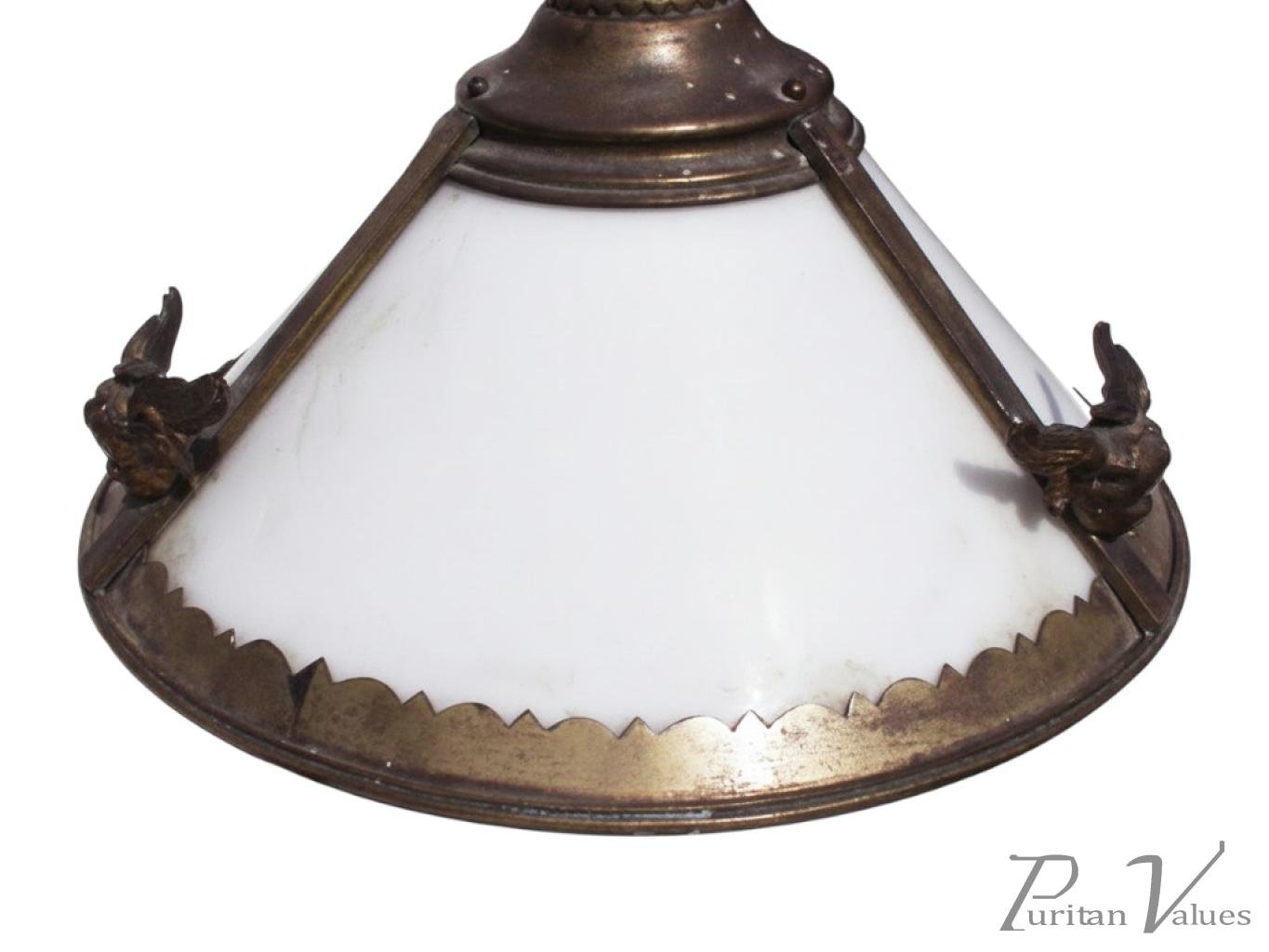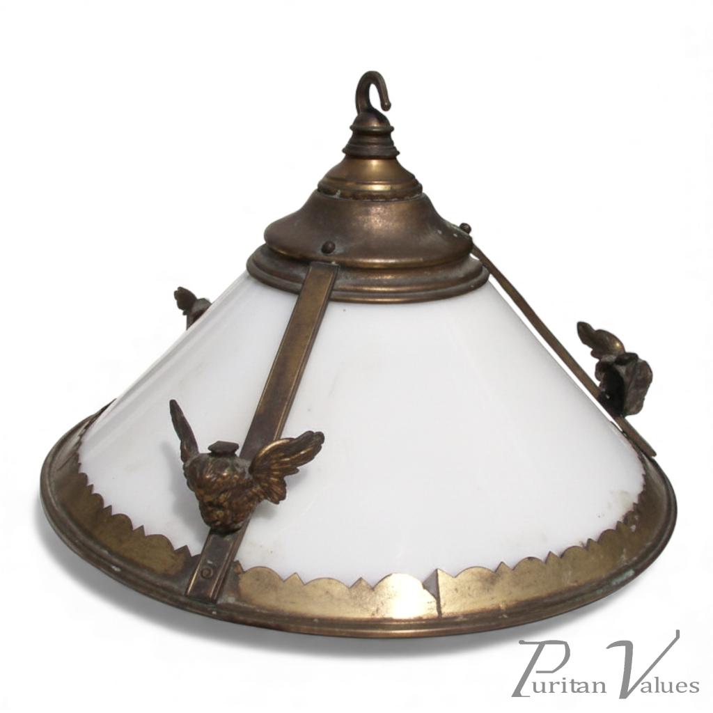 A period brass light fitting with winged cherubs retaining its original white glass shade, retained by brass outer rings.