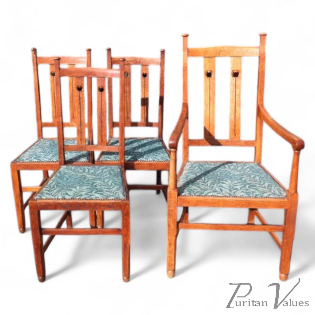 A Set of Four Arts and Crafts Oak Dining Chairs Covered in Morris & Co., Fabric