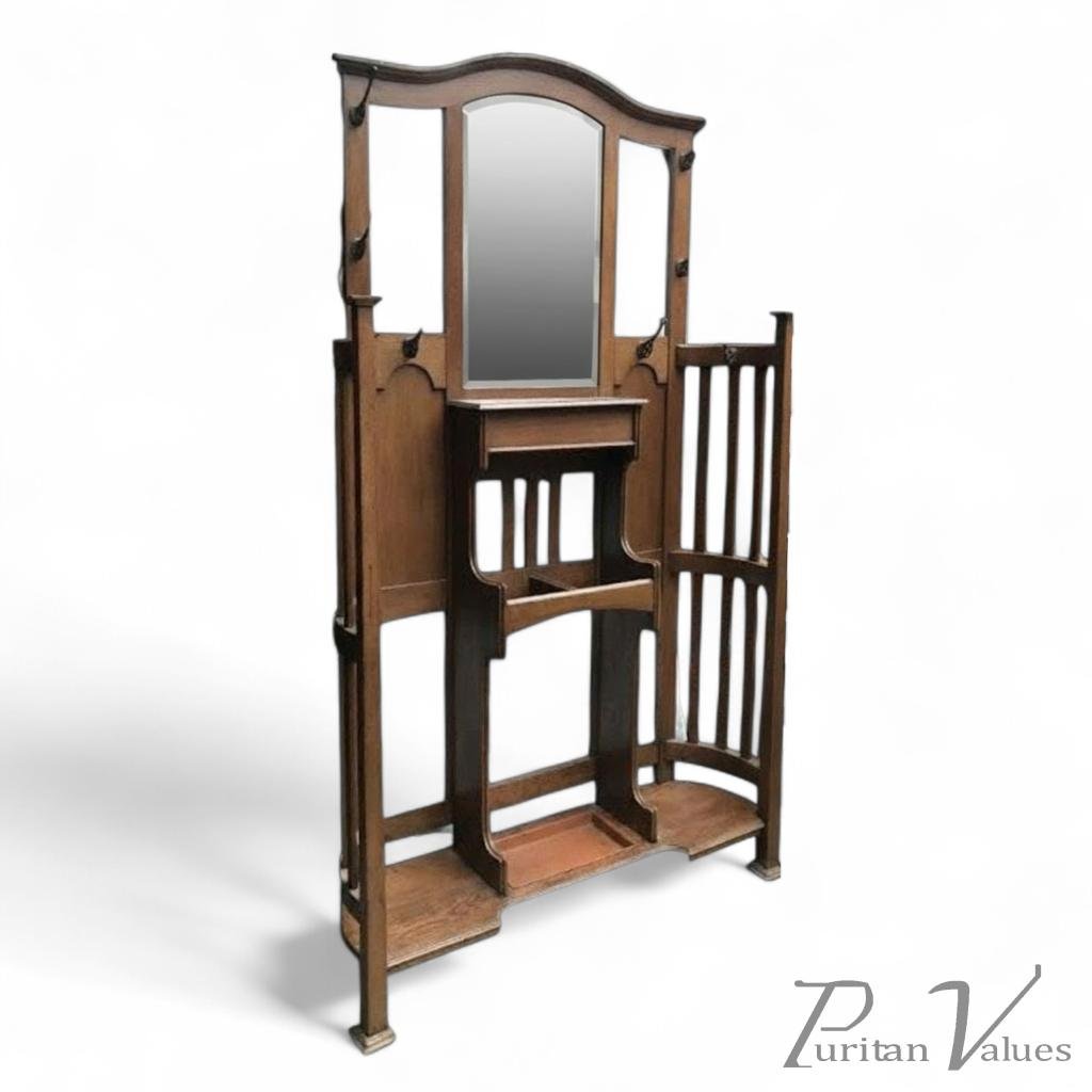 Glasgow School oak hallstand produced around c.1905, representing the mature phase of the Arts and Crafts Movement (1880–1910) as expressed through the restrained geometry of Glasgow design. The piece exemplifies the union of practicality and architectural form central to the movement’s domestic furnishings.
