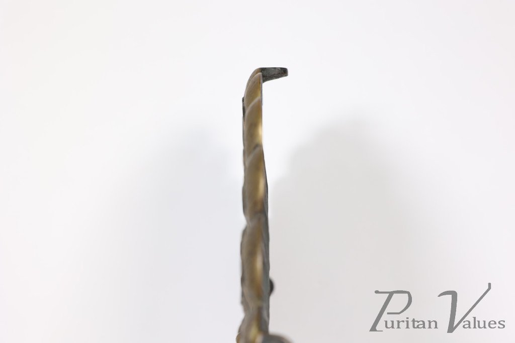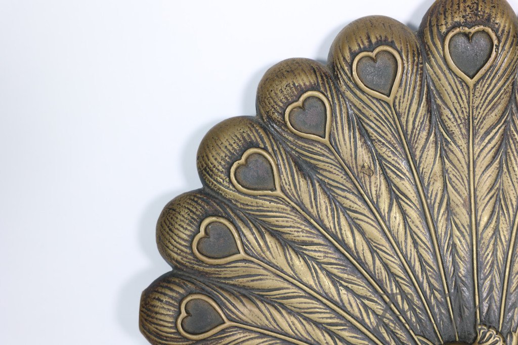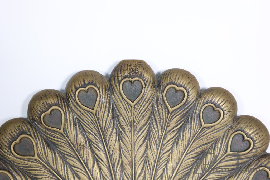 Aesthetic Movement, c.1885. A cast brass trivet in the form of a stylised peacock with a fan-shaped tail composed of radiating feathers terminating in heart motifs. The surface displays finely chased and moulded detailing, exemplifying the decorative naturalism central to the Aesthetic Movement. The design balances symbolic elegance with practical craftsmanship, typical of the period’s domestic metalwork.