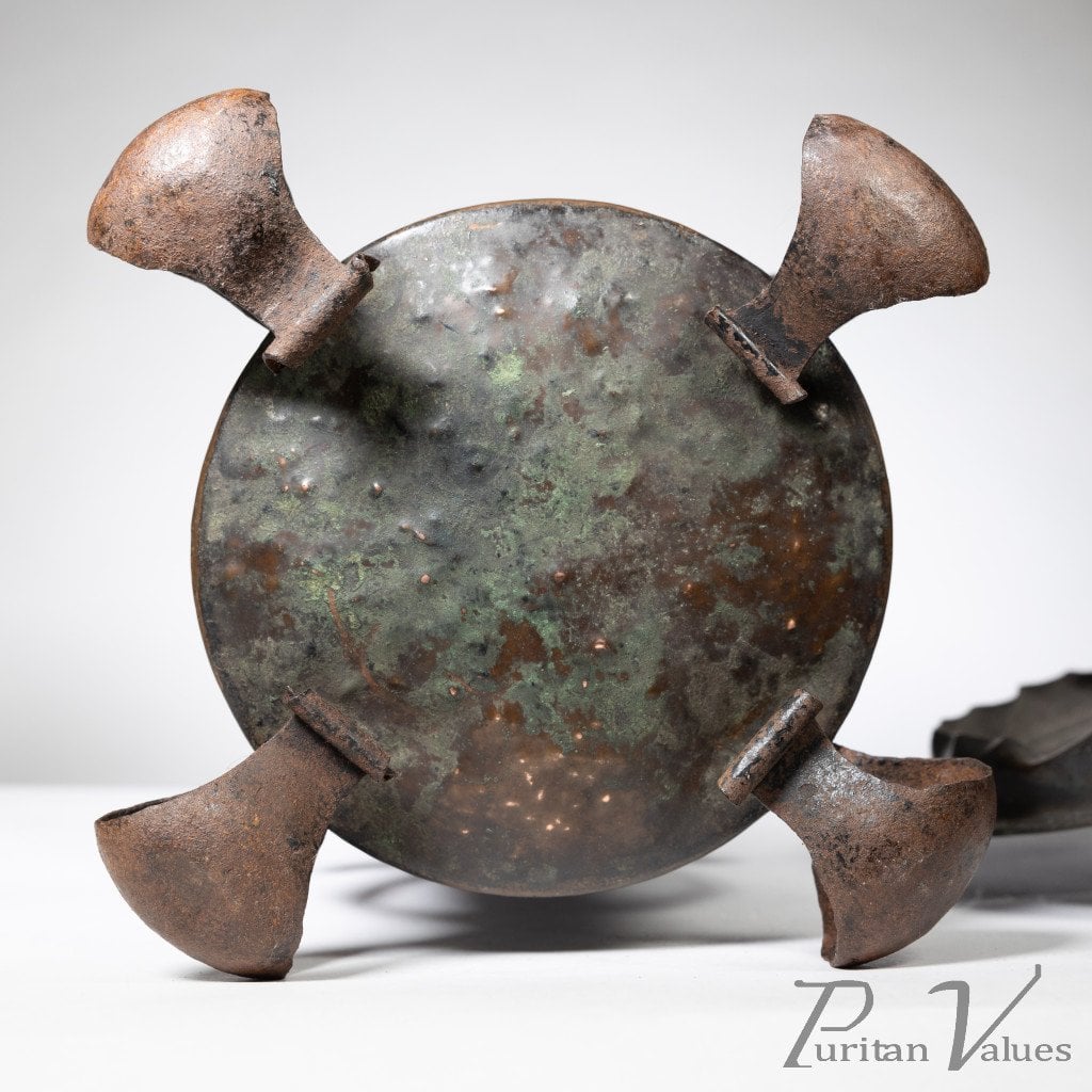 An Arts and Crafts brass coal bucket with a hand wrought iron handle to the lid and four stylized hand repousse hearts with hand wrought iron floral style feet.