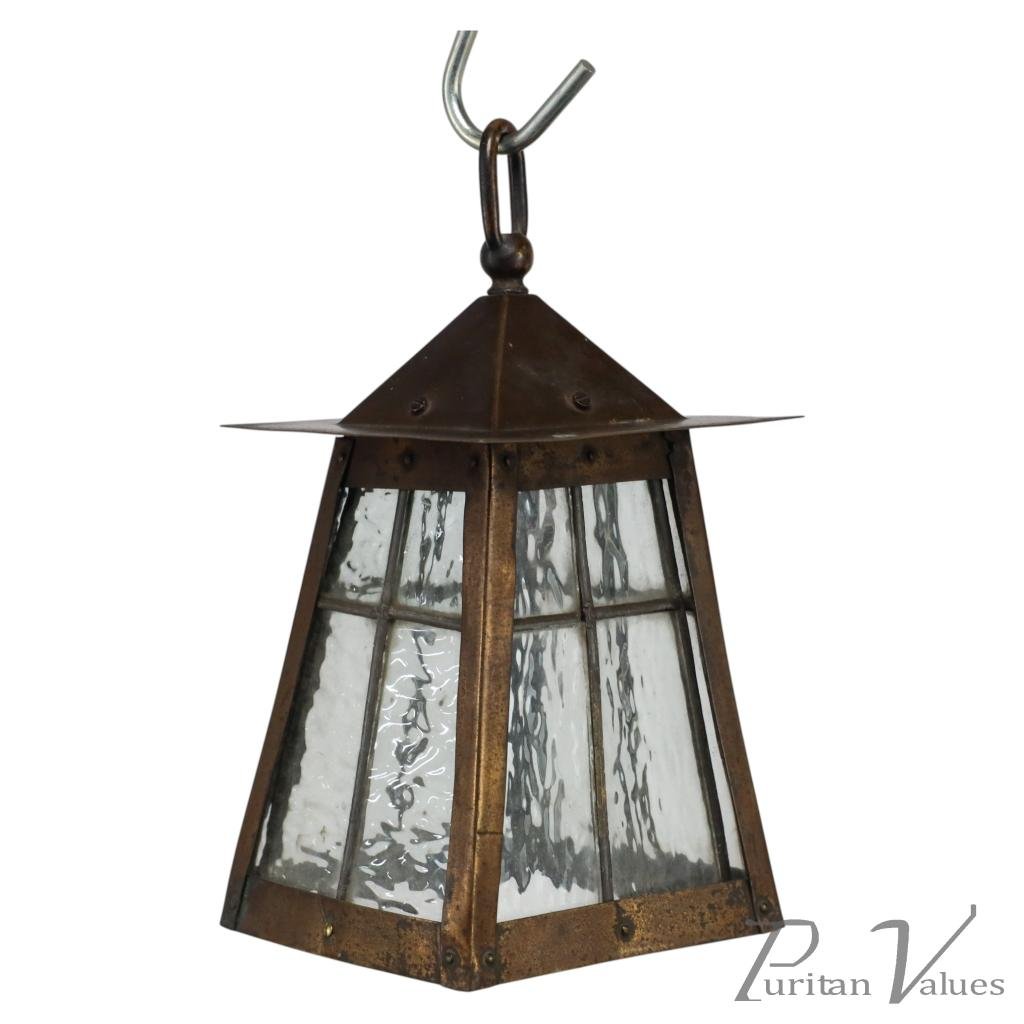 An Arts and Crafts little copper lantern with the original opaque shade with undulations in the glass. We have original brass chain to hang this at any height.