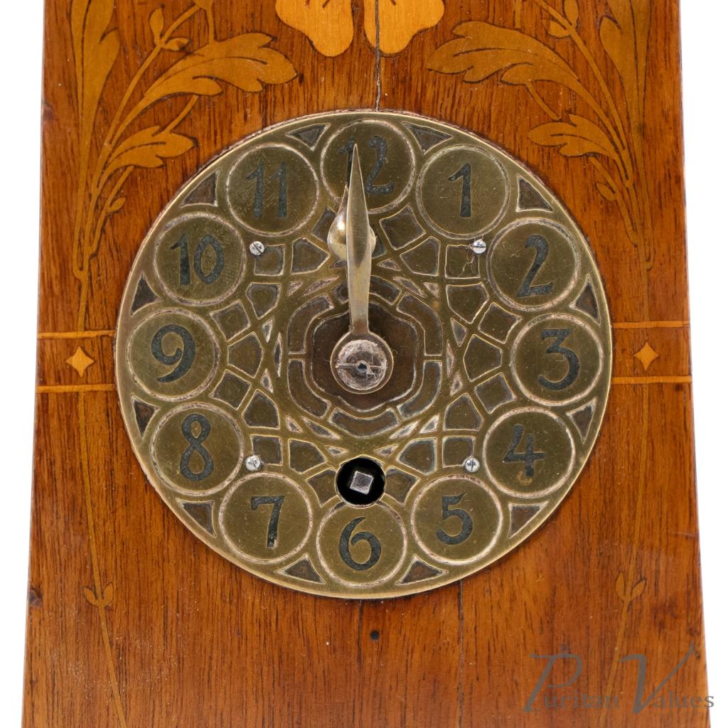 An Art Nouveau mantle clock in the Nieuwe Kunst or Jugendstil style, with inlaid floral decoration, brass dial, and probable French 8-day pendulum movement.