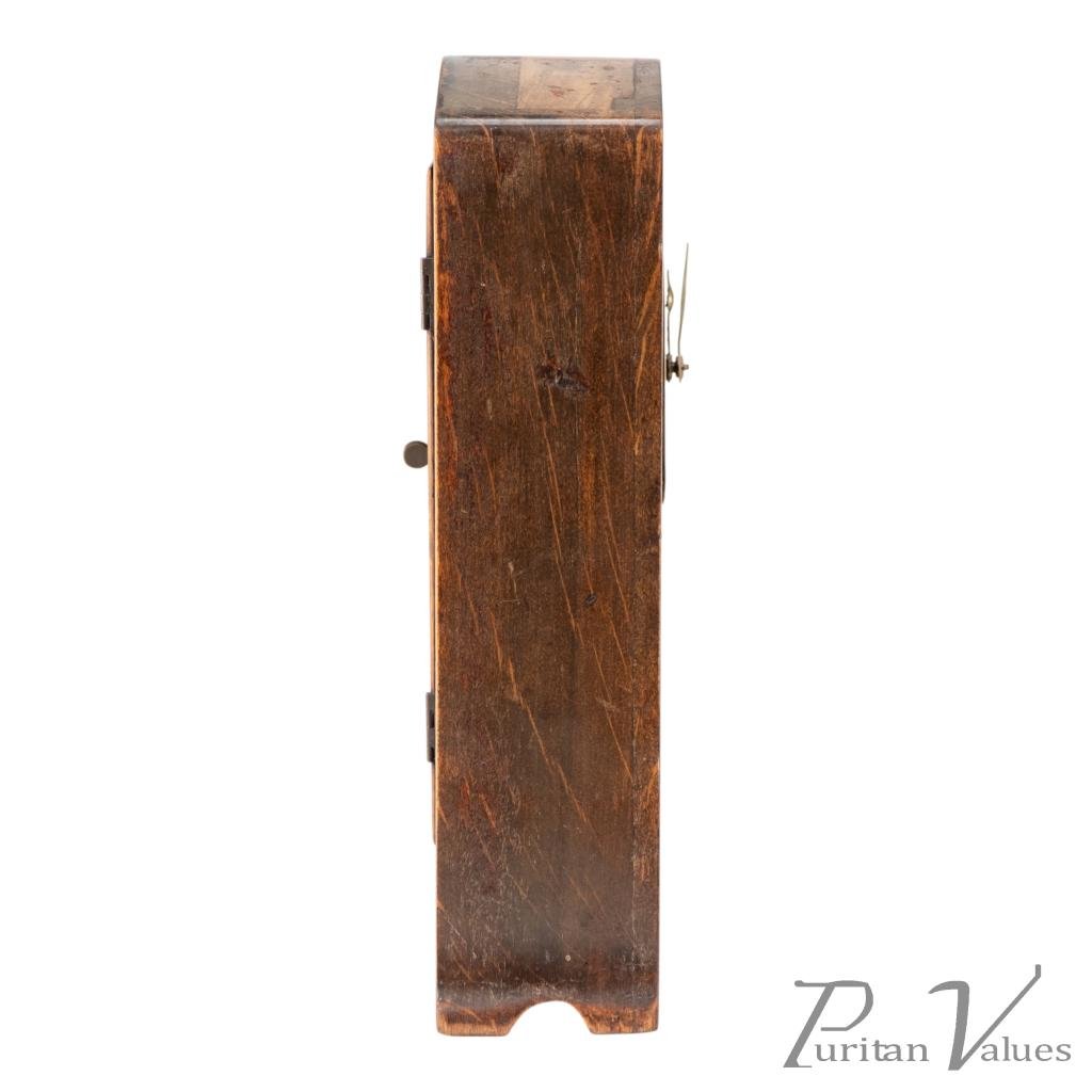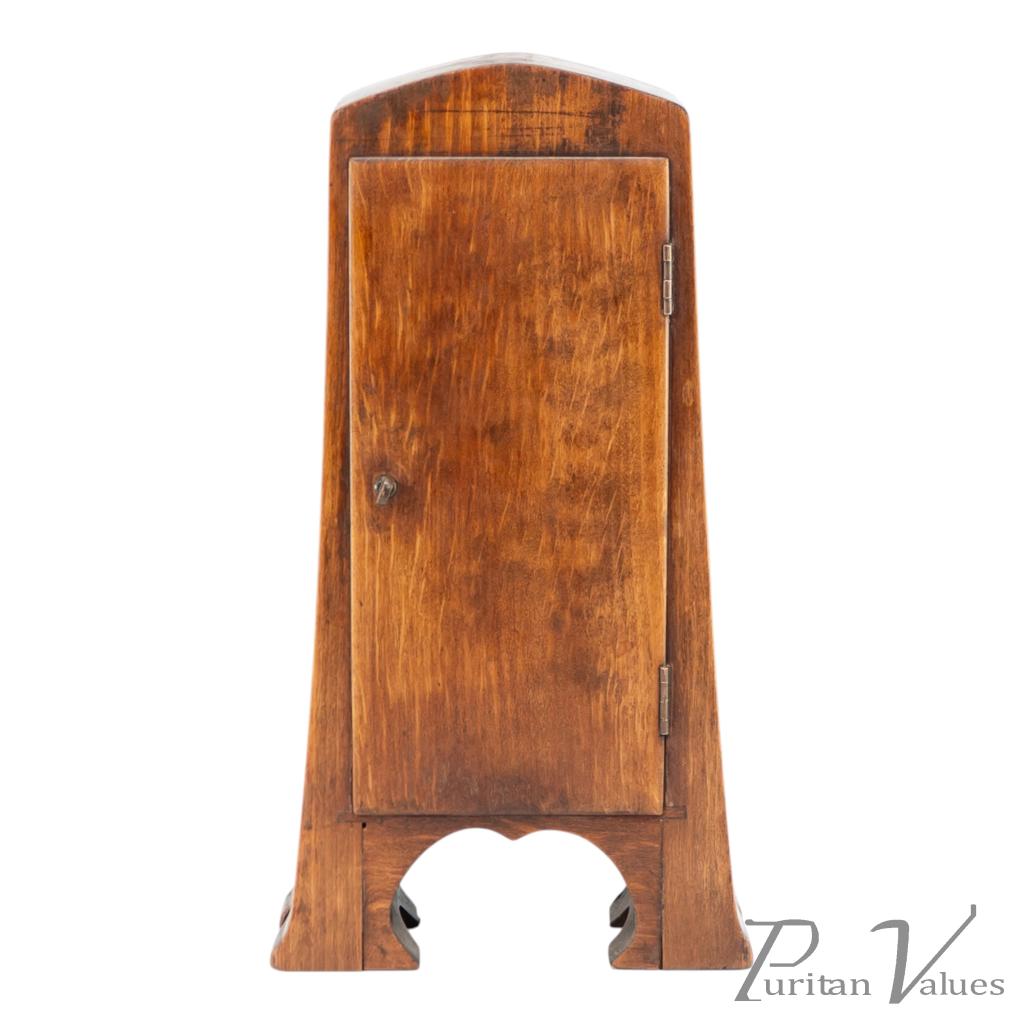 This Art Nouveau mantle clock was produced around 1900, reflecting the transitional idiom between Dutch Nieuwe Kunst and German Jugendstil design (1895 – 1910). The oak case is tapering in form, inlaid with scrolling floral marquetry, and raised on boot-shaped feet beneath an arched base.