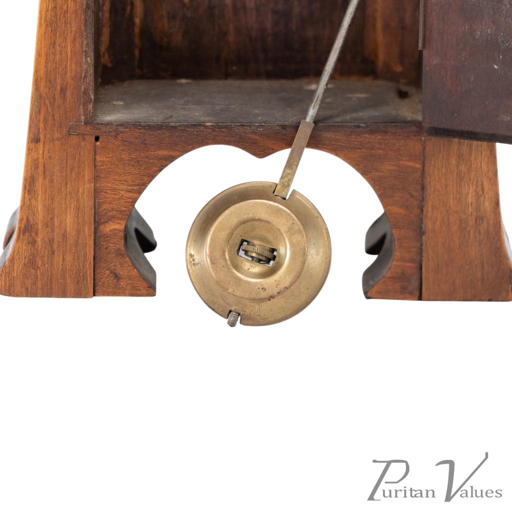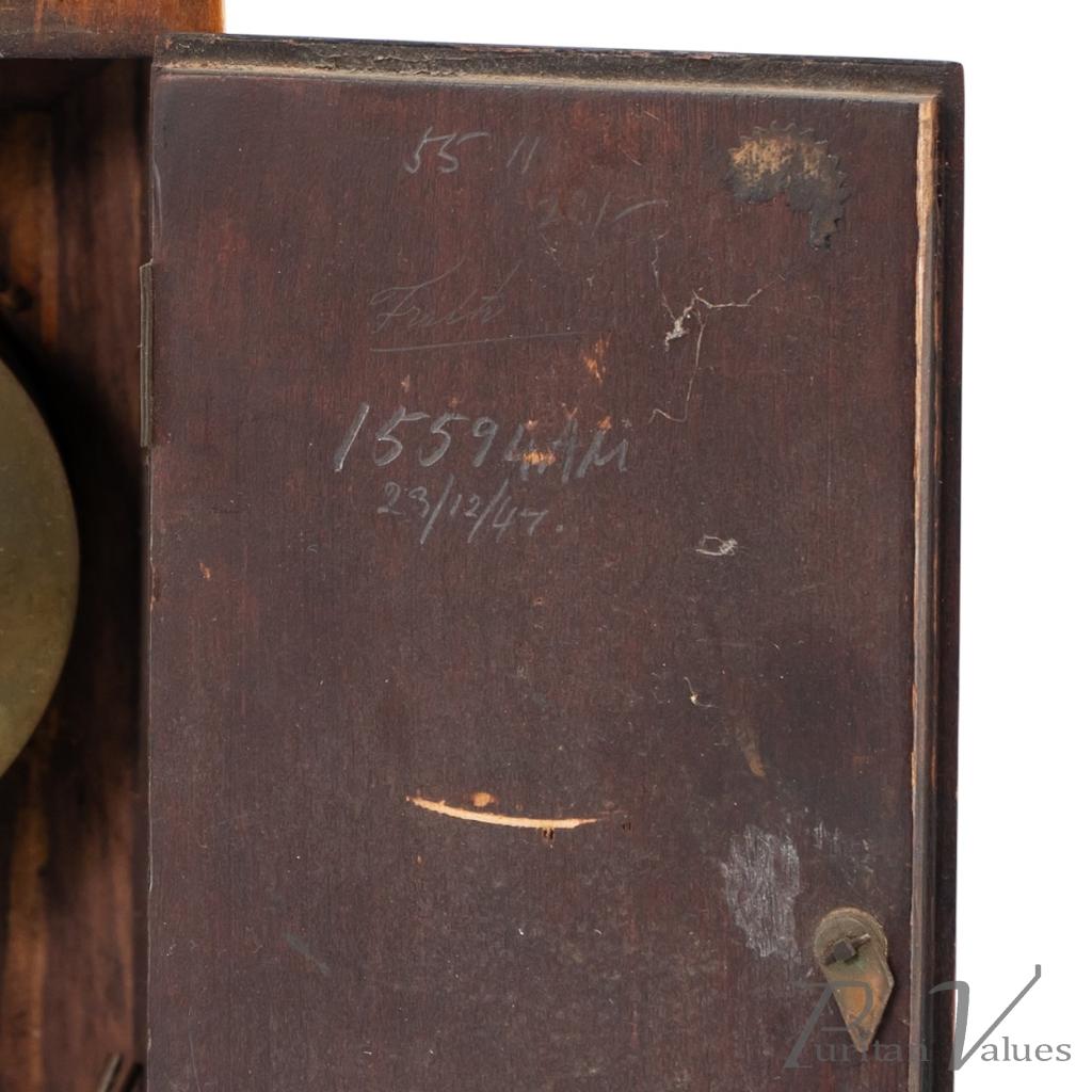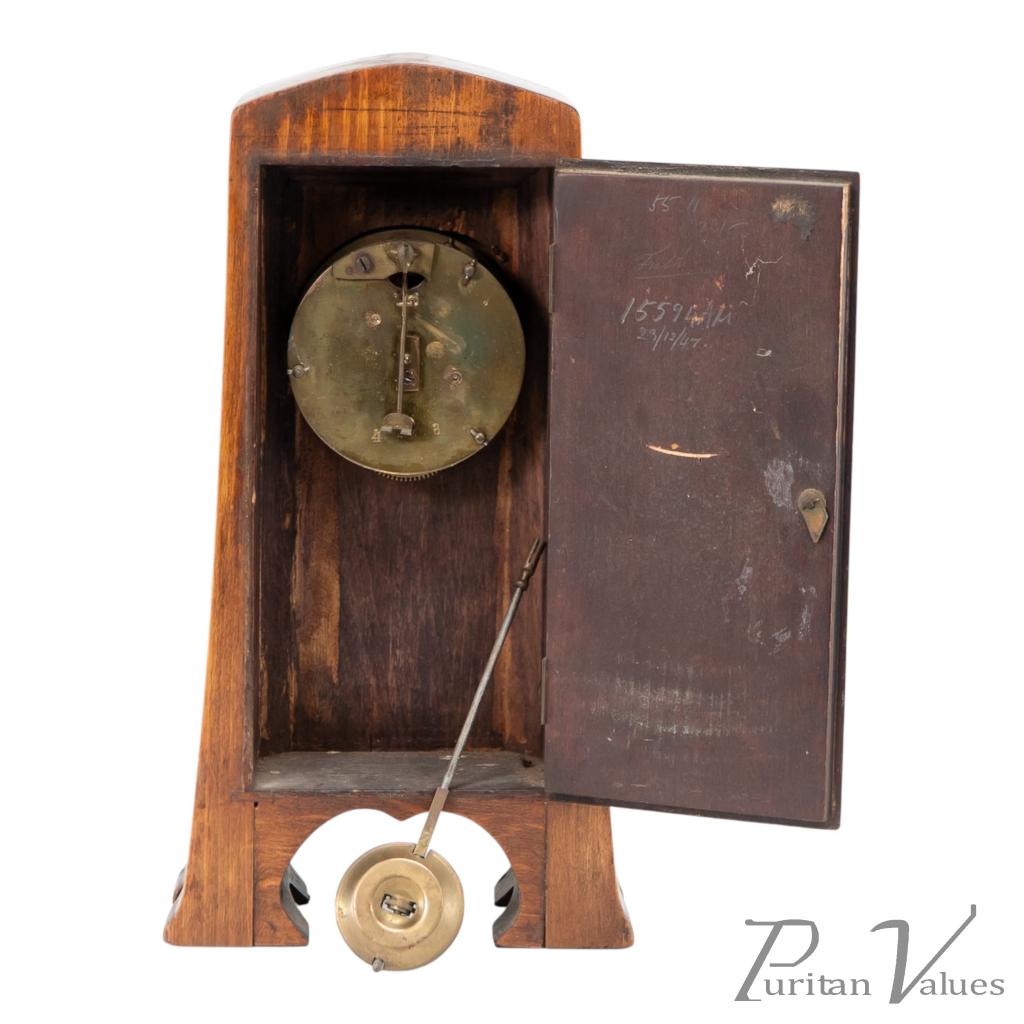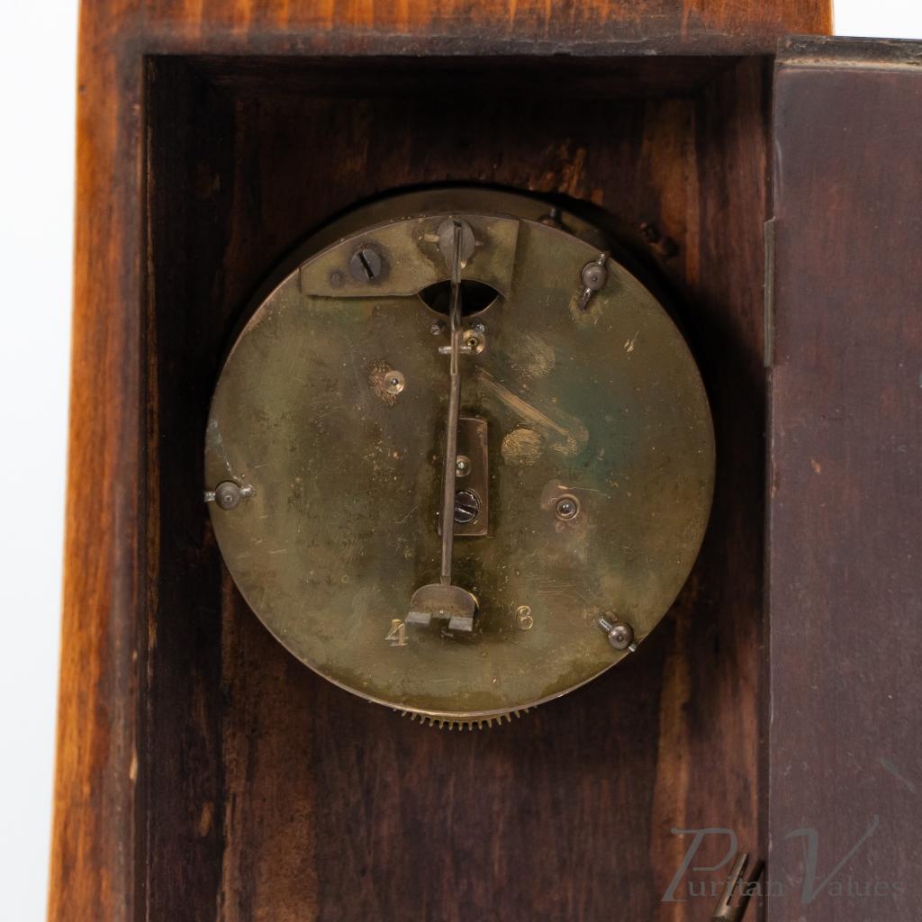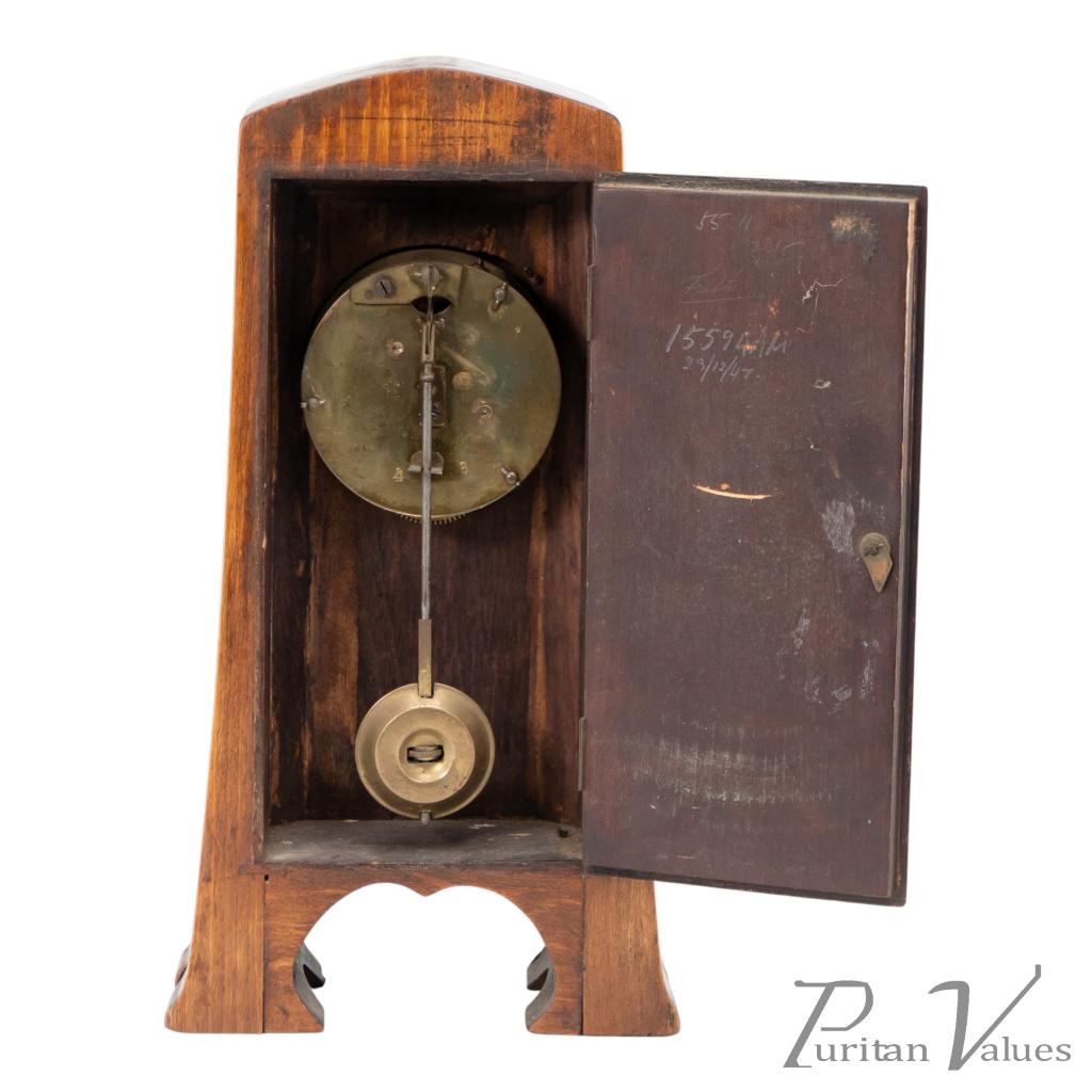 Within, the clock houses a probable French 8-day pendulum-regulated movement, fitted with an adjustable disc to the pendulum base for time regulation. The mechanism is accessed through a rear oak door, the interior retaining original pencilled markings consistent with early-twentieth-century service inscriptions.