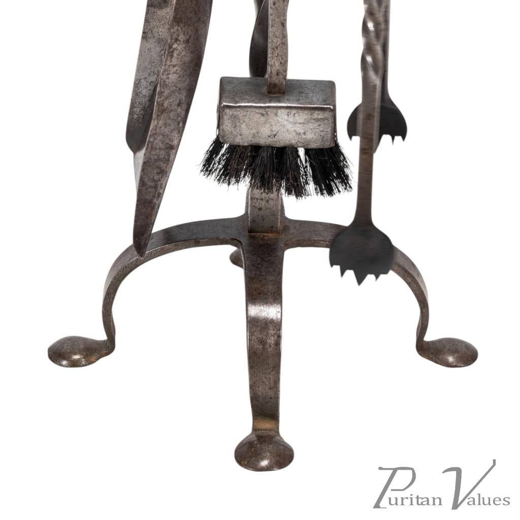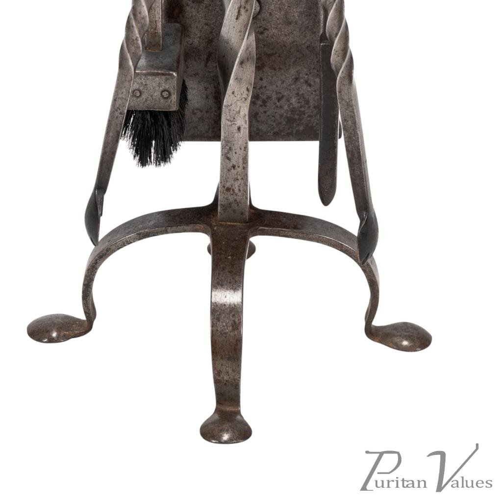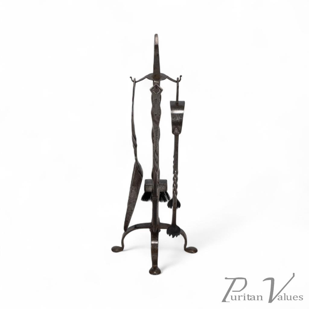 Hand-forged by a skilled blacksmith working within the Cotswold tradition, the tools exhibit subtle hammer marks and twisted shafts, testifying to the integrity of hand production central to the Arts & Crafts movement (1880–1910). The stand rises on a tripod base with shaped feet, balanced for both durability and proportion.