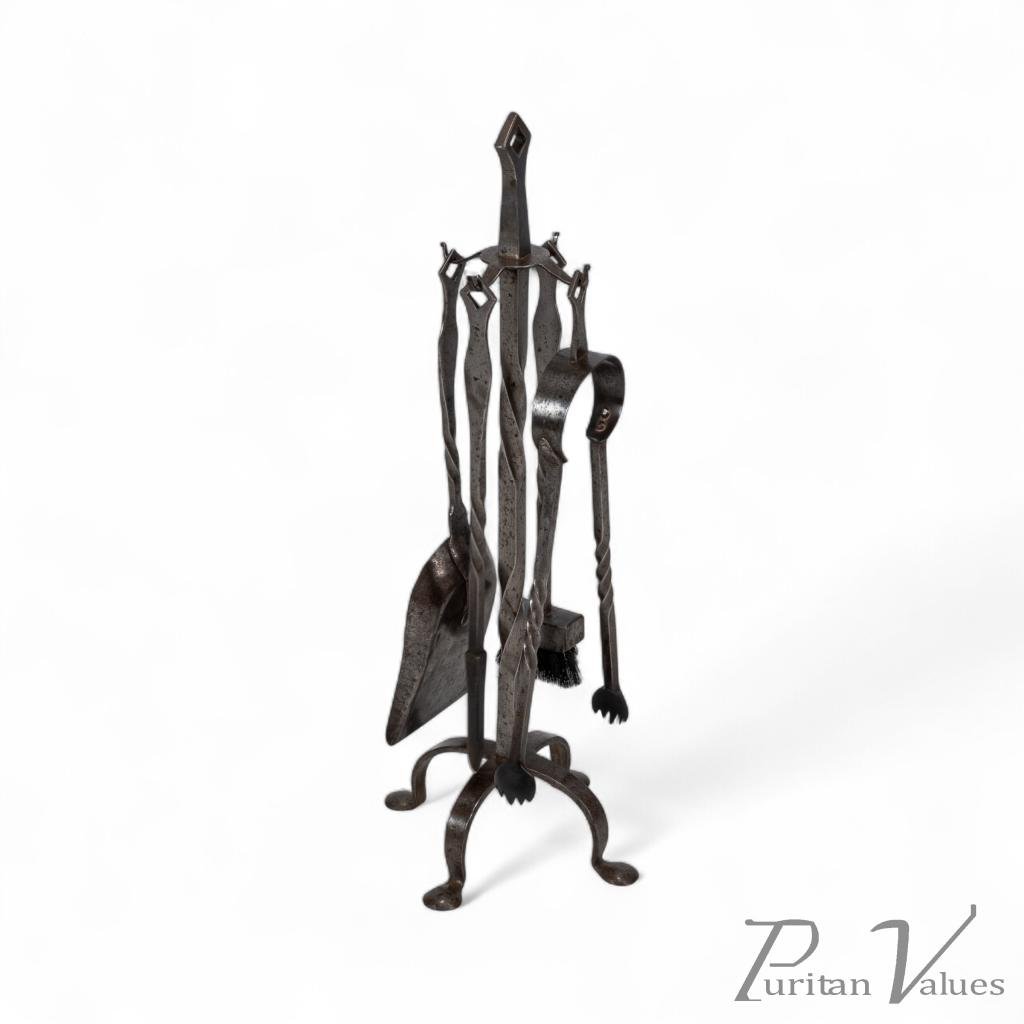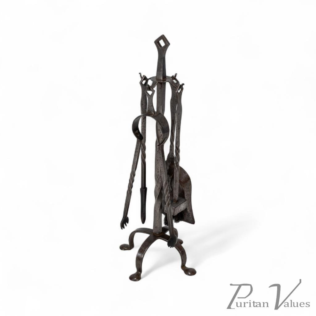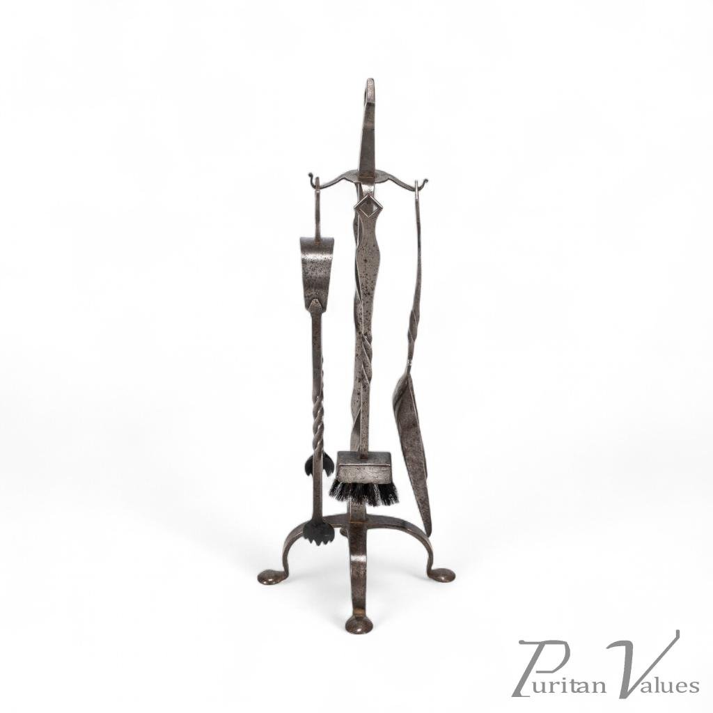 This Arts & Crafts fire tool set (c.1910) exemplifies the Cotswold School approach to domestic metalwork, where utility and craftsmanship were inseparable. The set comprises four forged steel implements: poker, shovel, brush, and tongs, each suspended from the original stand with rat-tail scroll hooks beneath a pierced diamond finial.