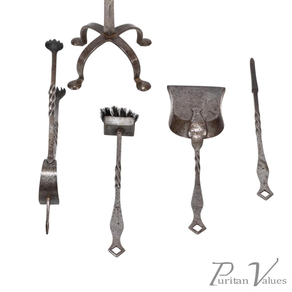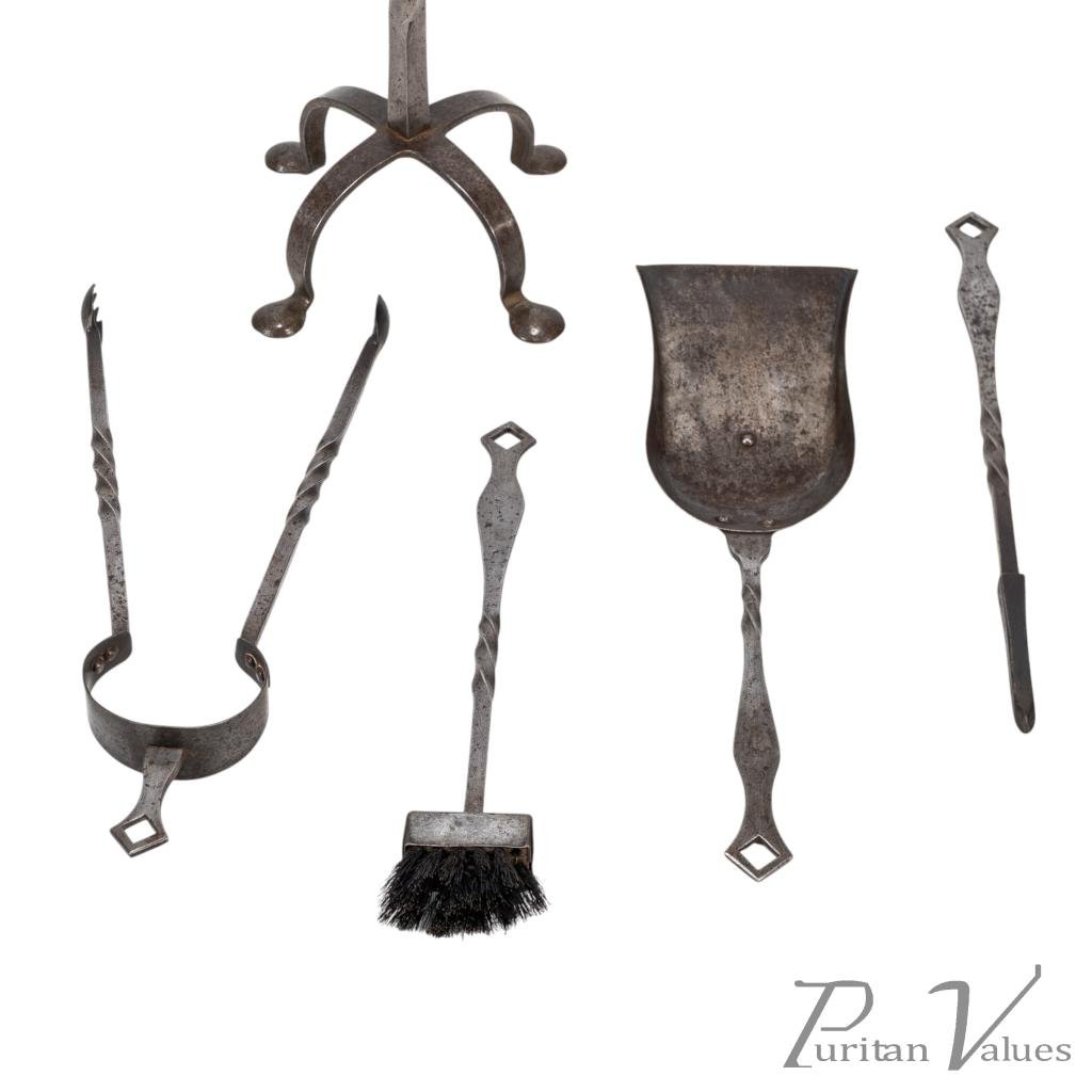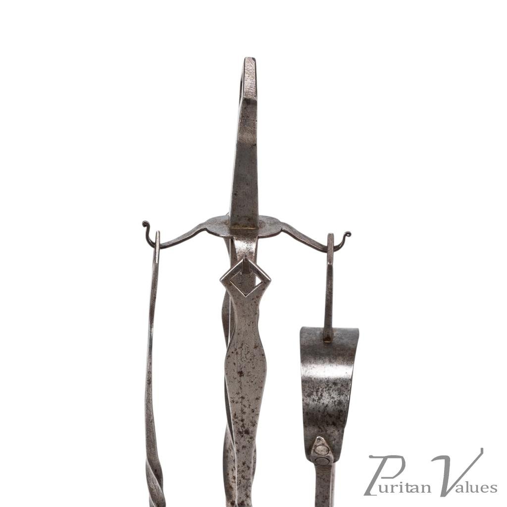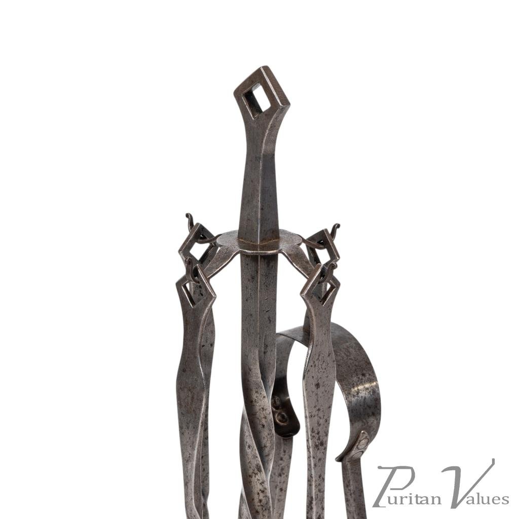 This Arts & Crafts fire tool set (c.1910) exemplifies the Cotswold School approach to domestic metalwork, where utility and craftsmanship were inseparable. The set comprises four forged steel implements: poker, shovel, brush, and tongs, each suspended from the original stand with rat-tail scroll hooks beneath a pierced diamond finial.