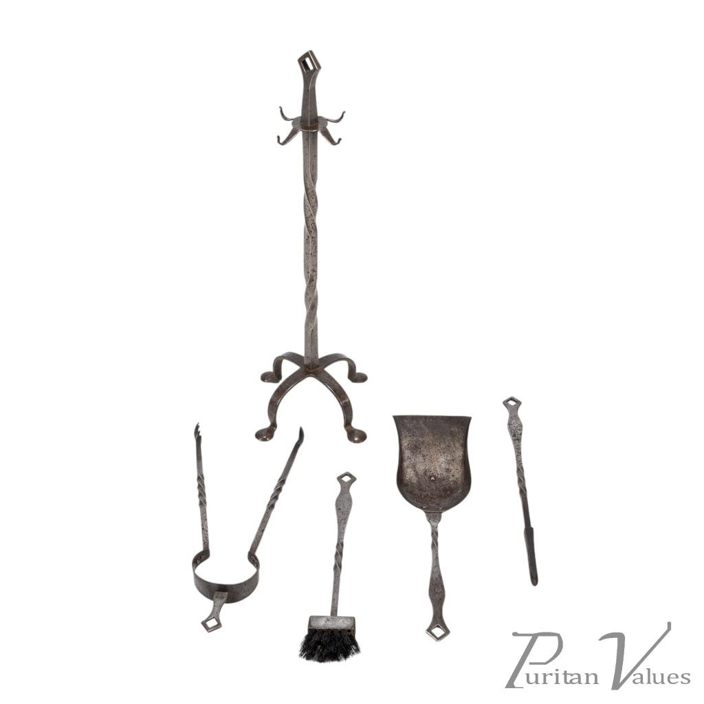 A Cotswold School Arts & Crafts fire tool set of forged steel, comprising poker, tongs, shovel, and brush, hanging from the original hand-forged stand with scroll holders.