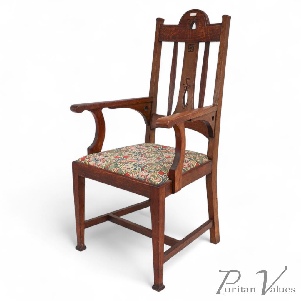 Goodall, Lambs & Heighway of Manchester, stamped under the seat rail. An Arts & Crafts Oak armchair with stylized floral carved back splat and pierced sweeping arm supports.