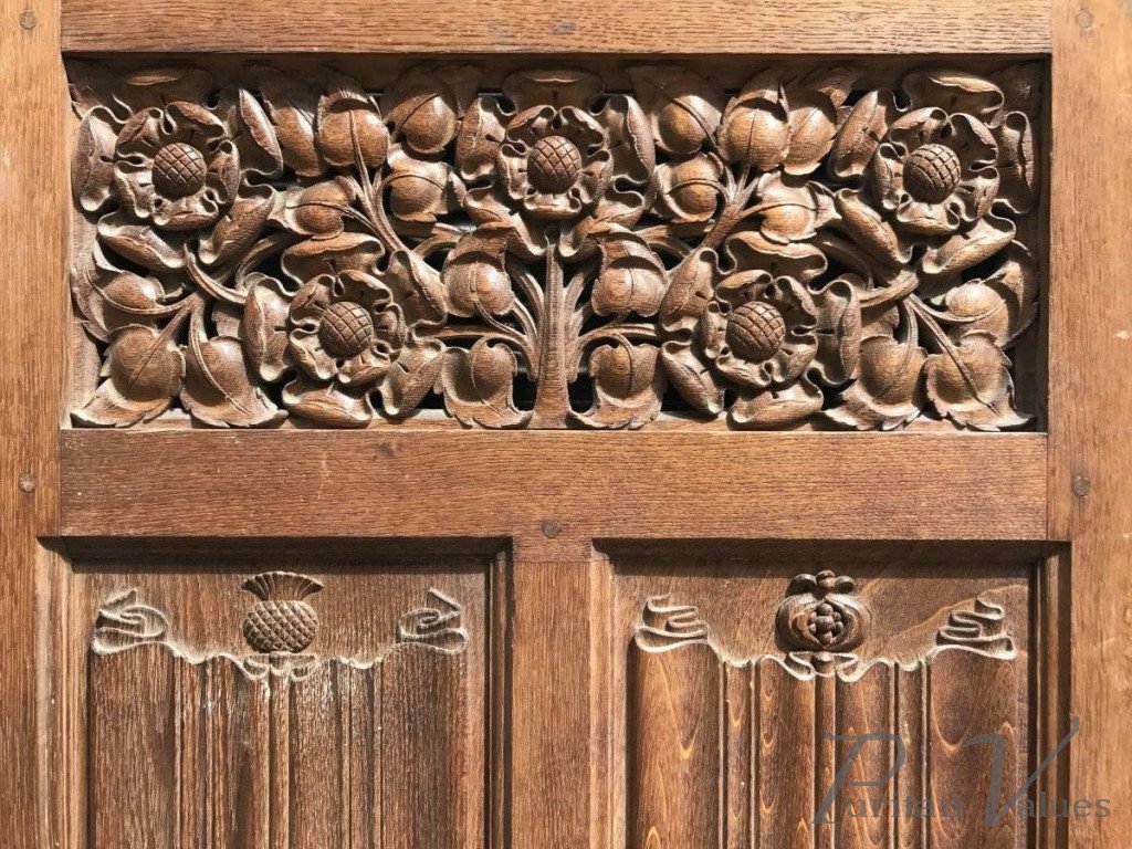 Style of Arthur Simpson of Kendal. Four lengths of early Arts and Crafts interior oak wall panelling with hand-carved roses, pomegranates and grapes to the upper sections and carved linen fold details to the lower sections topped with carved thistles and pomegranate flower heads. Would make a great counter front. Total length measures approx 9 feet 3 inches and 35 inches tall. Originally from a church, probably part of the choir stands. I also have another identical panel carved with the same details listed here. I will consider selling in two pairs.