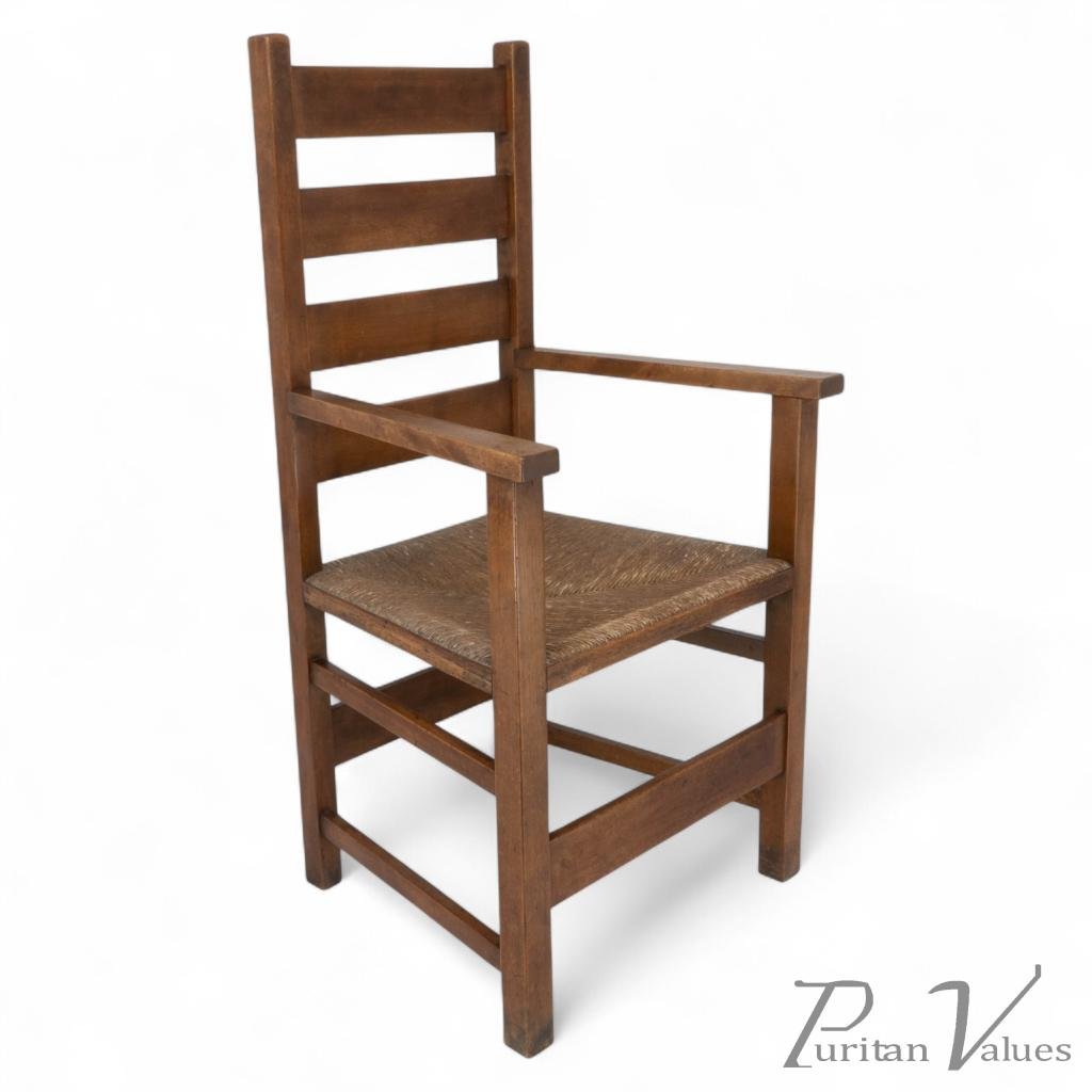 An Arts and Crafts oak and rush seat ladder back armchair made by J. P. White at The Pyghtle Works in Bedford.