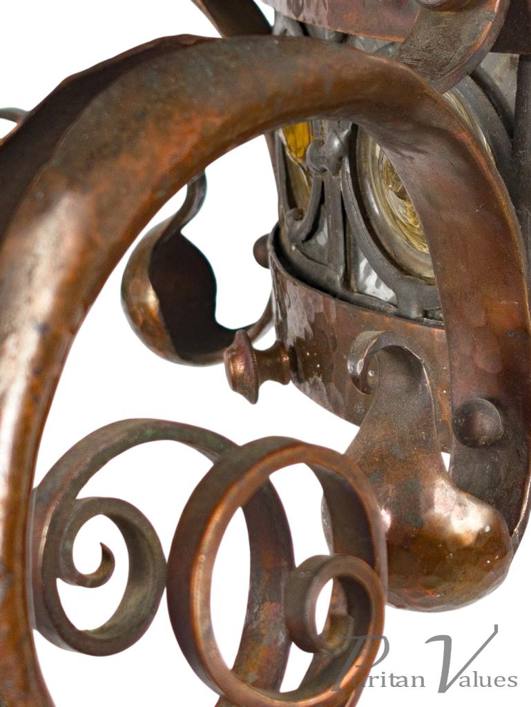 A heavy-gauge copper ring forms the main structural band, pierced to hold a sequence of hand-forged scrolls that project outward in varying spirals. Five primary arms sweep out from this ring, each arm flowing forward before turning in split scrolls at the ends. The upper recess between the arms guides the cable path internally, letting the flex run through the arm channels before dropping below the outer scroll to accept pendant shades. The hand-hammered finish, rounded riveting, and fluid forged scrolls echo the workshop character associated with the Guild.
