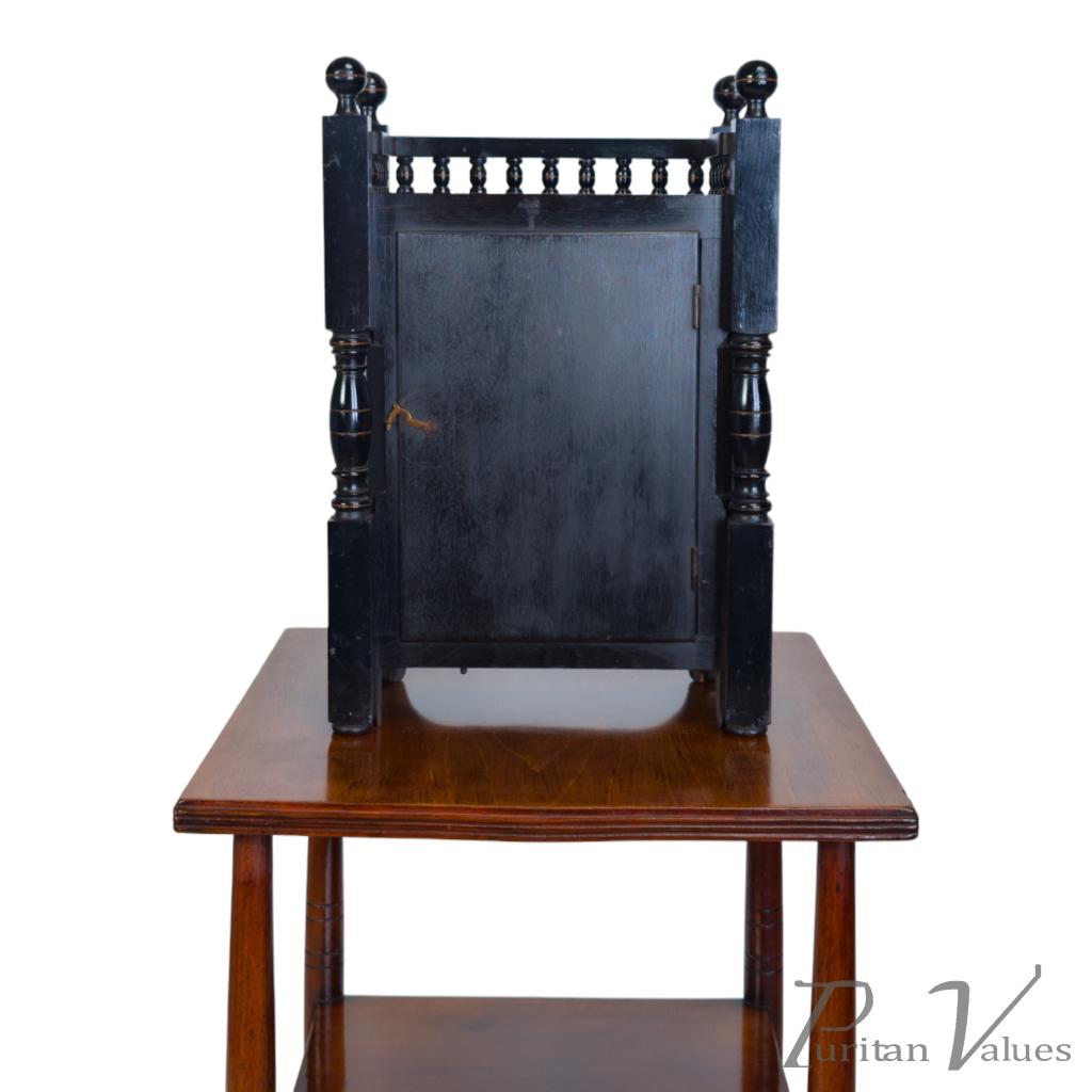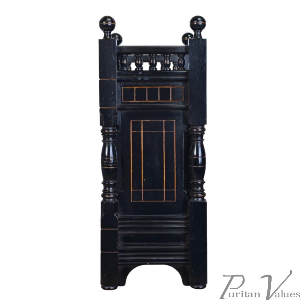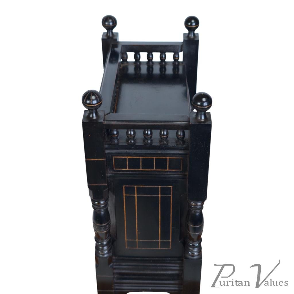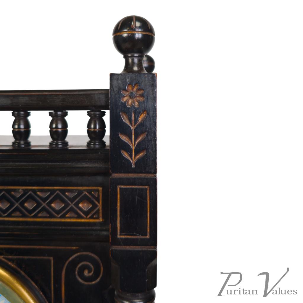 By Bruce James Talbert, an ebonised walnut mantel clock aligned to the Aesthetic Movement (1860–1890), c.1870. The piece reflects Talbert’s characteristic fusion of linear surface patterning, incised ornament and small architectural elements expressed in compact scale.