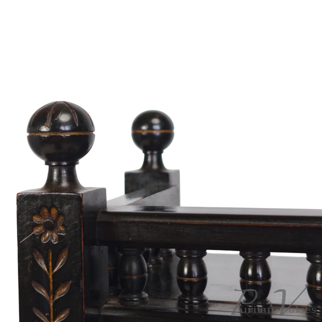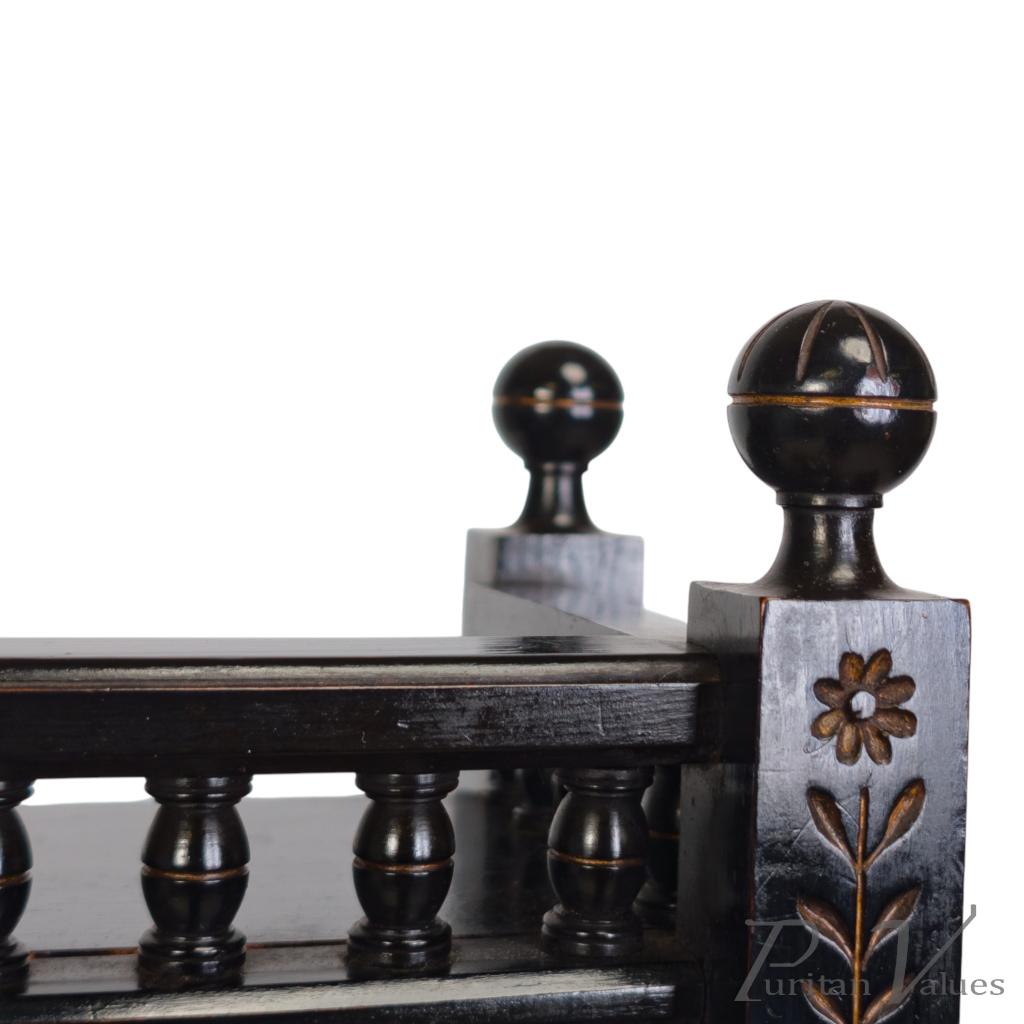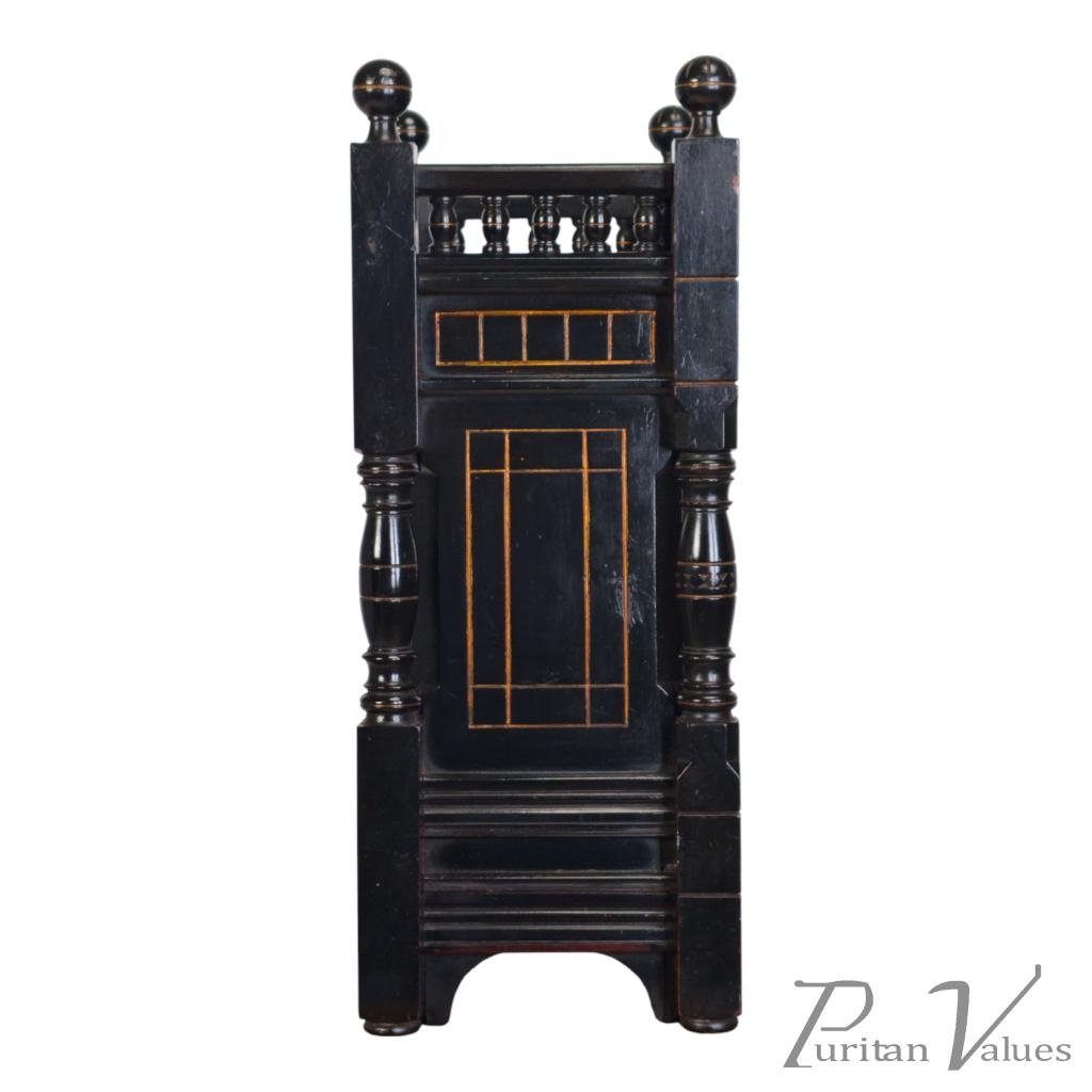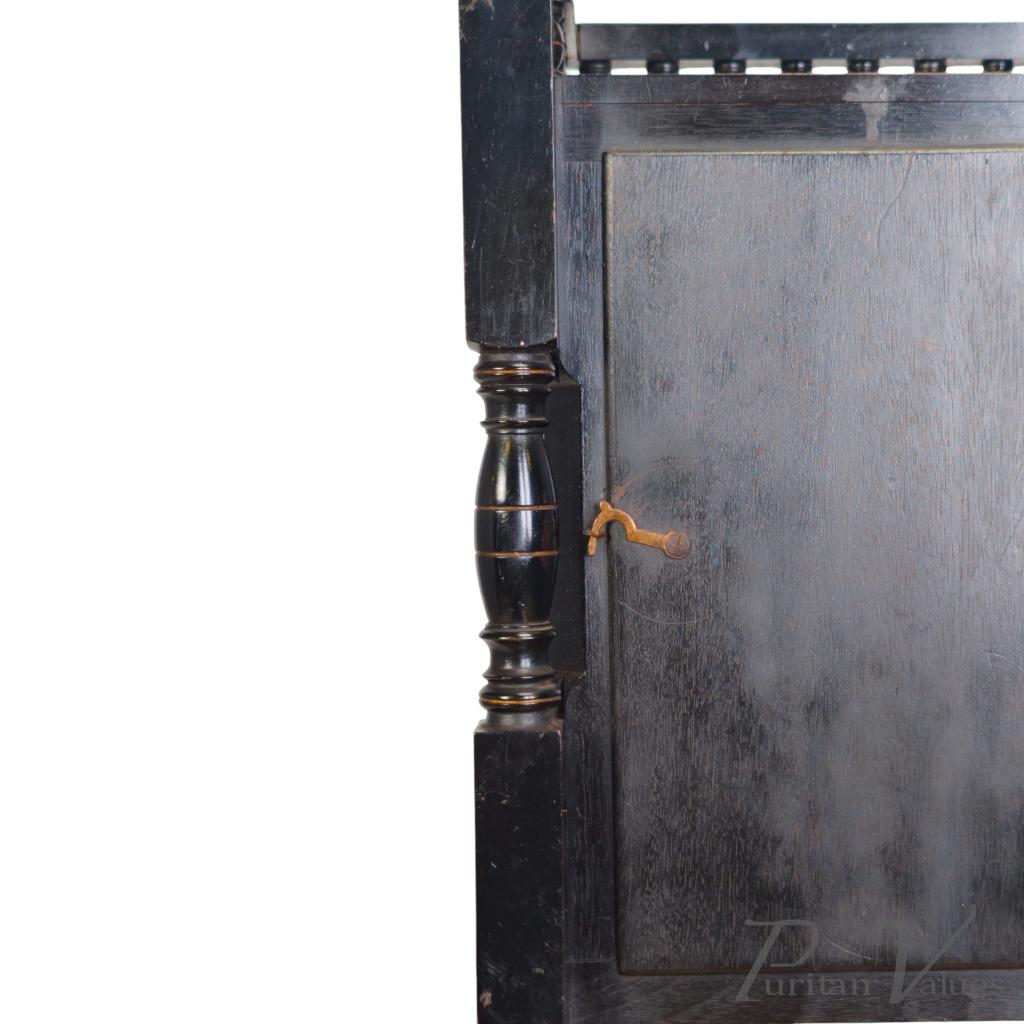 By Bruce James Talbert, an ebonised walnut mantel clock aligned to the Aesthetic Movement (1860–1890), c.1870. The piece reflects Talbert’s characteristic fusion of linear surface patterning, incised ornament and small architectural elements expressed in compact scale.
