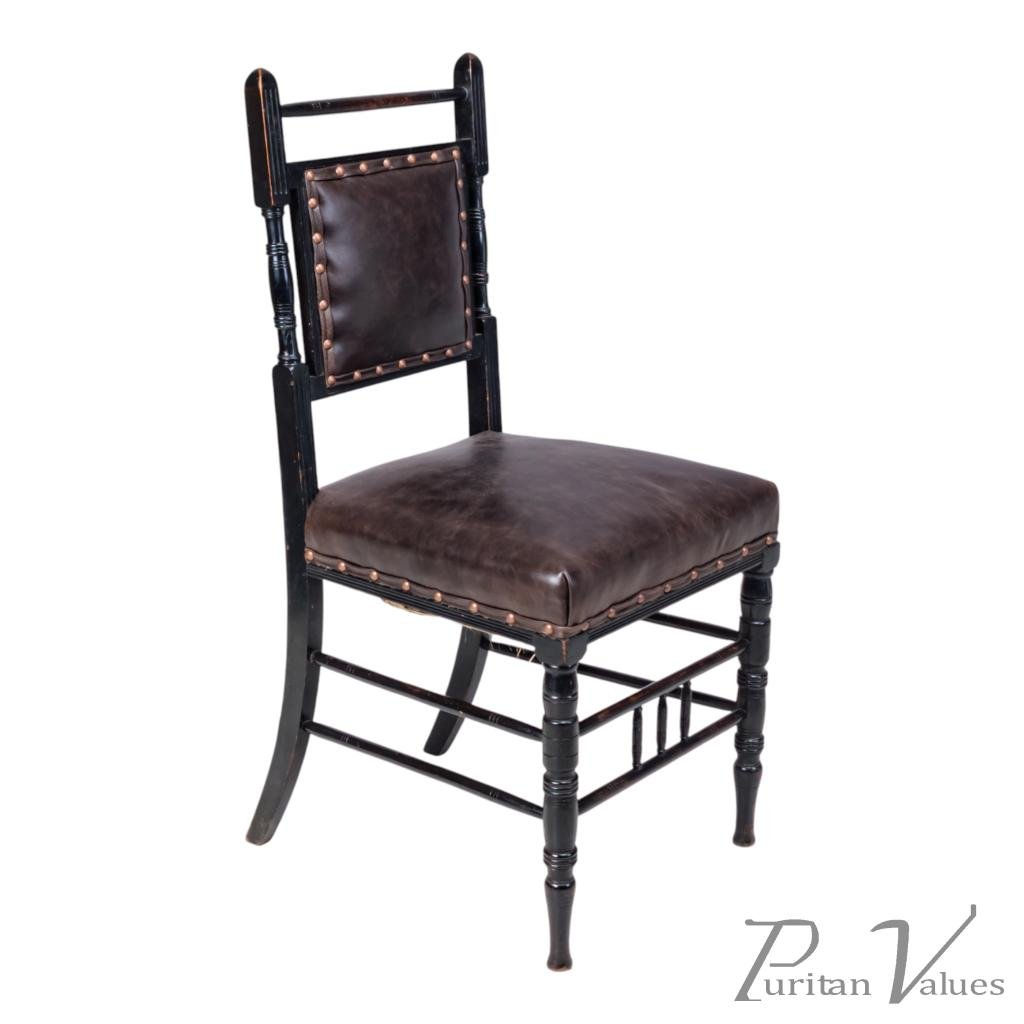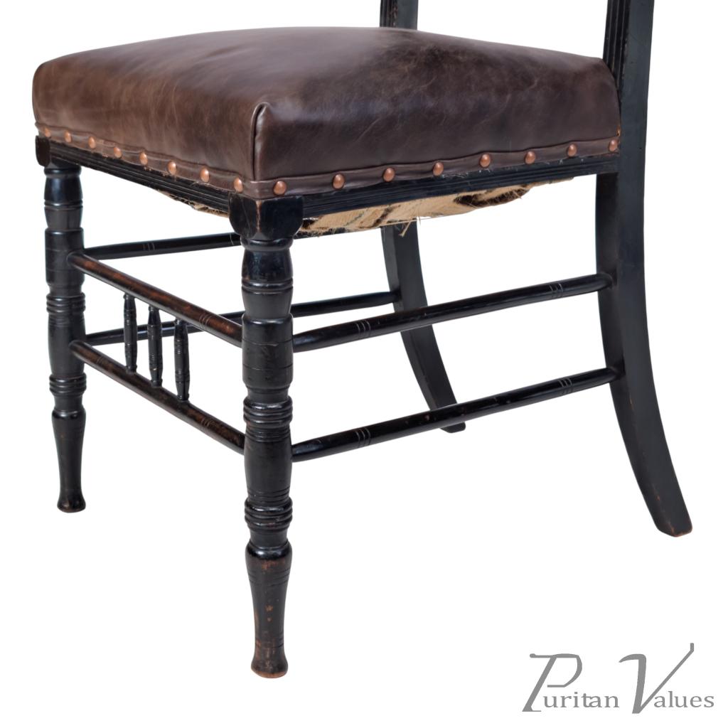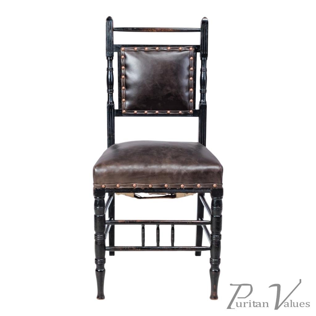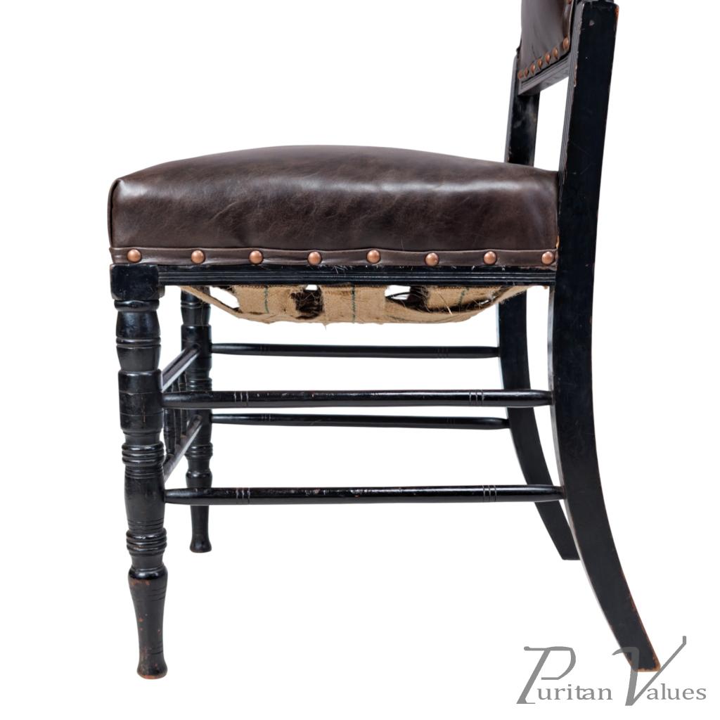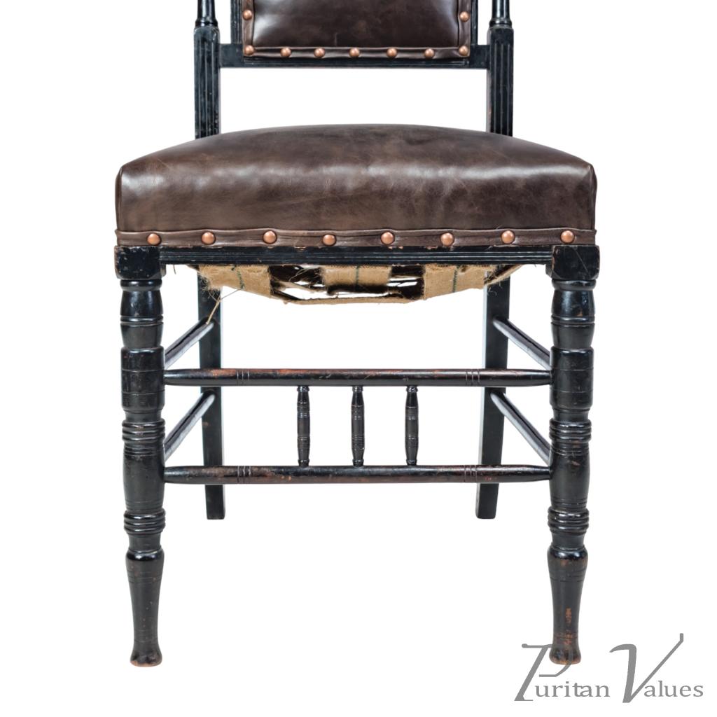 Ebonised walnut side chair attributed to Bruce Talbert for Gillows & Co. c.1880, Aesthetic Movement, with turned details, incised stretchers, and leather upholstery.