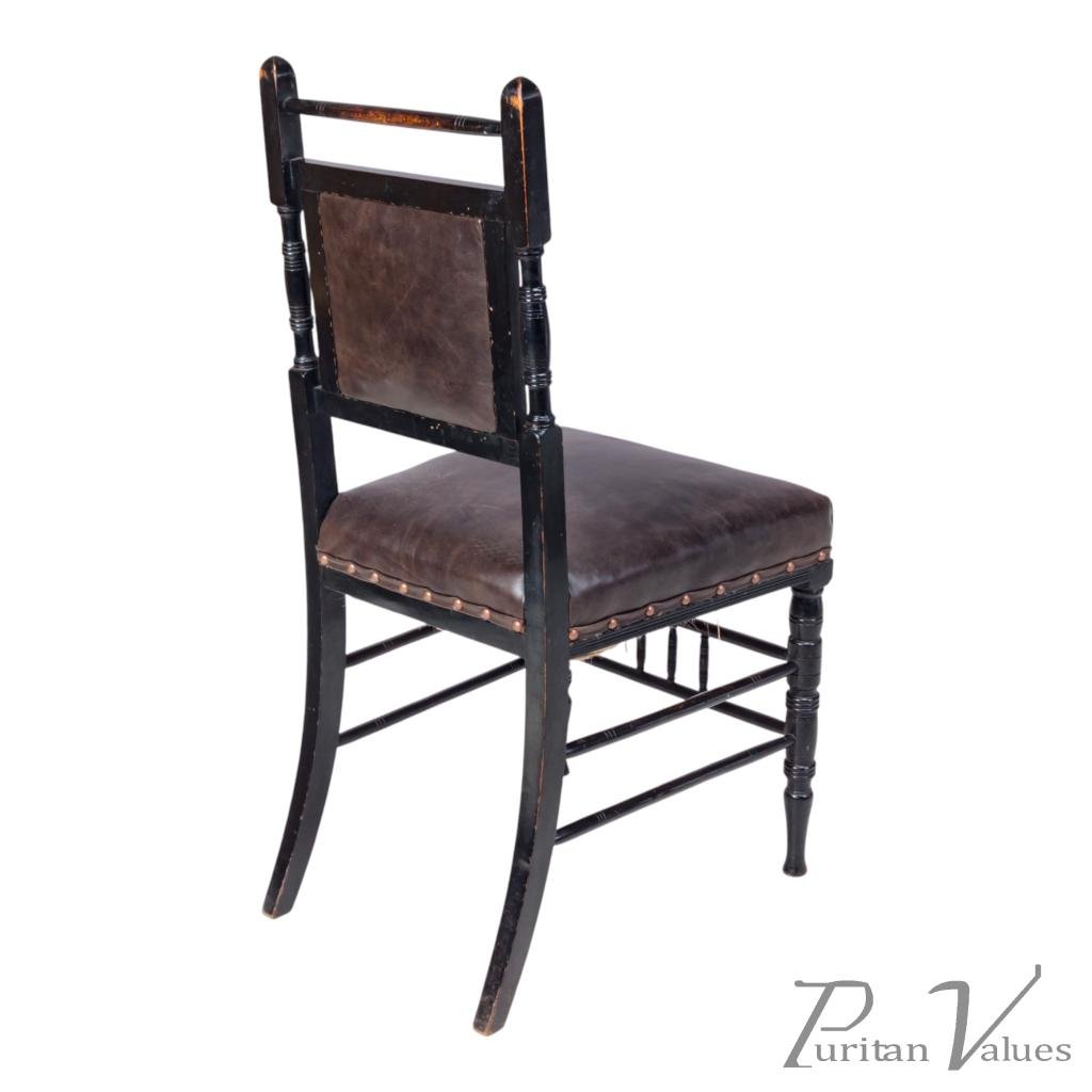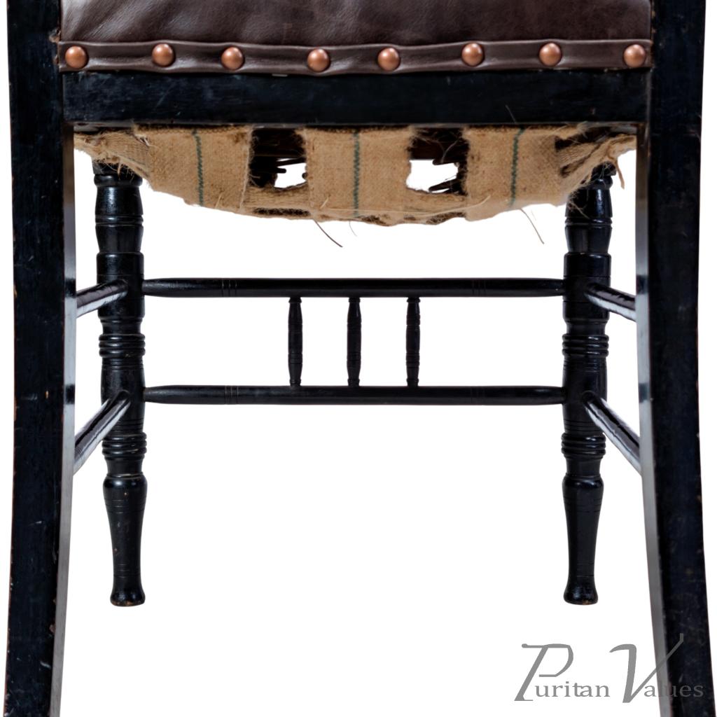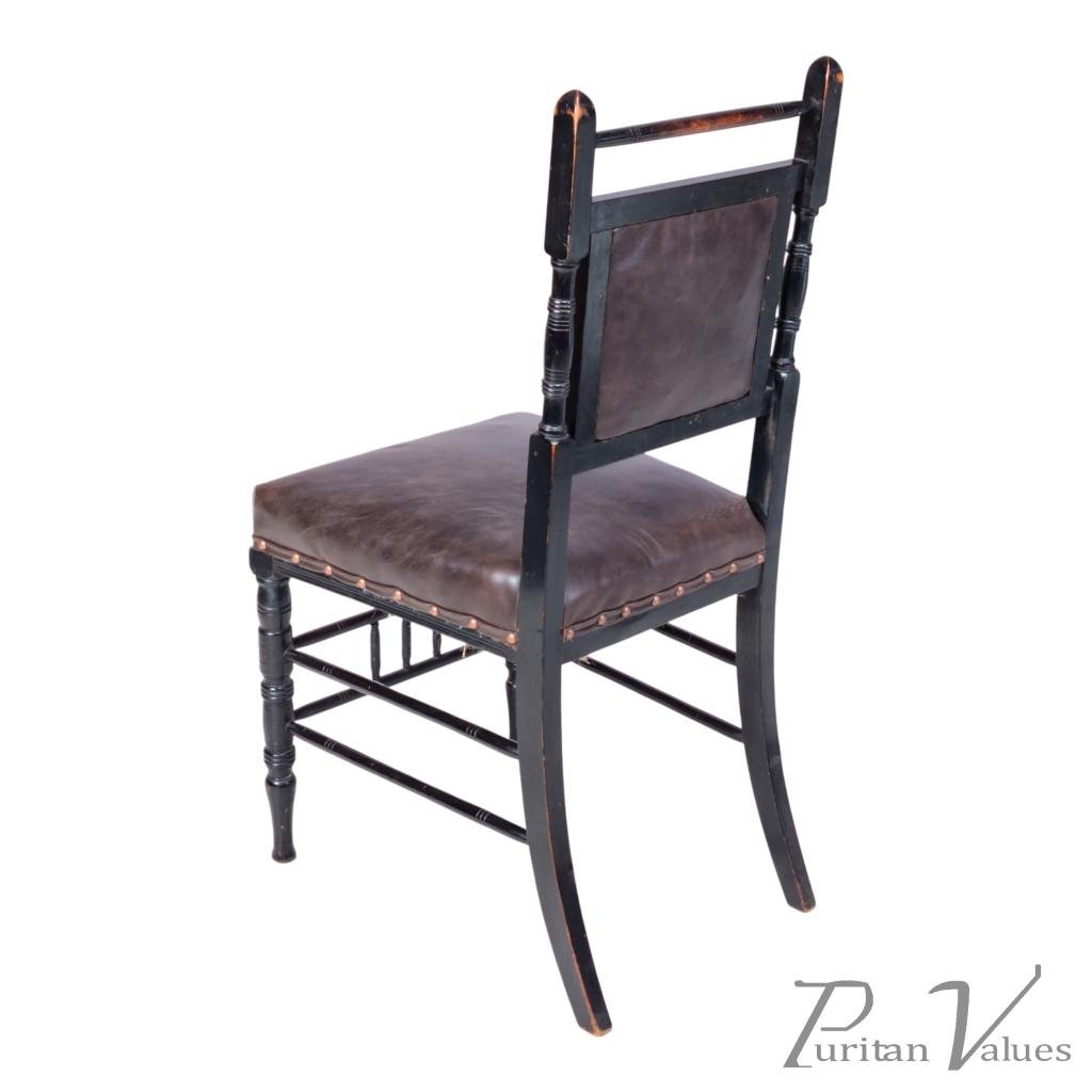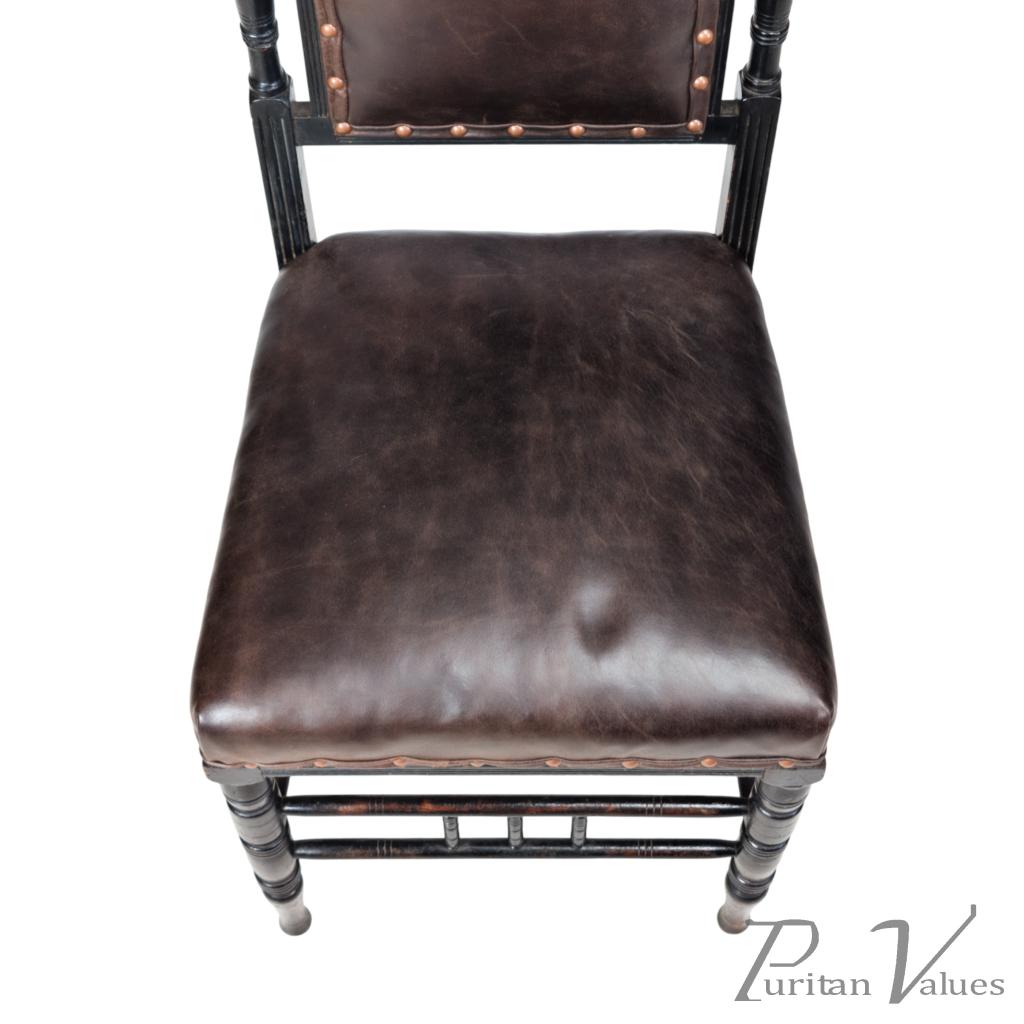 Ebonised walnut side chair attributed to Bruce Talbert for Gillows & Co. c.1880, Aesthetic Movement, with turned details, incised stretchers, and leather upholstery.