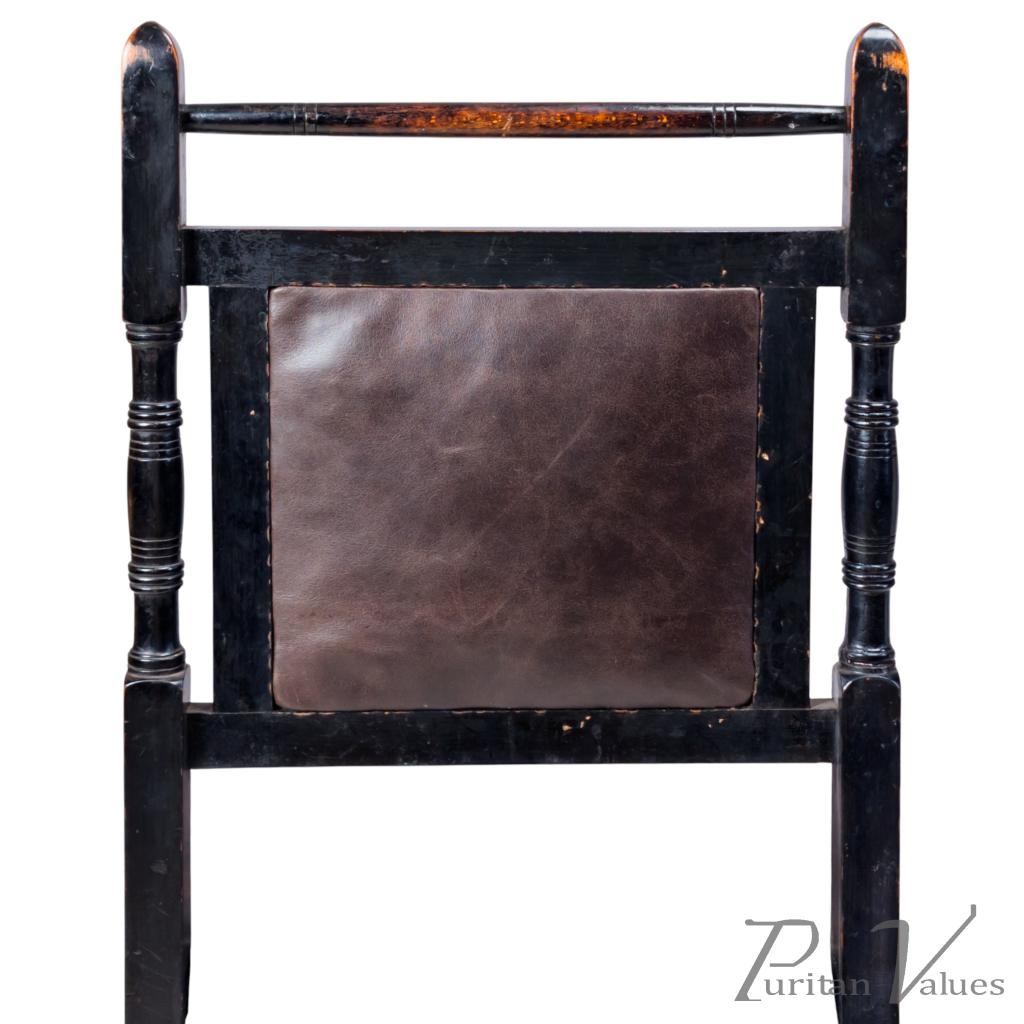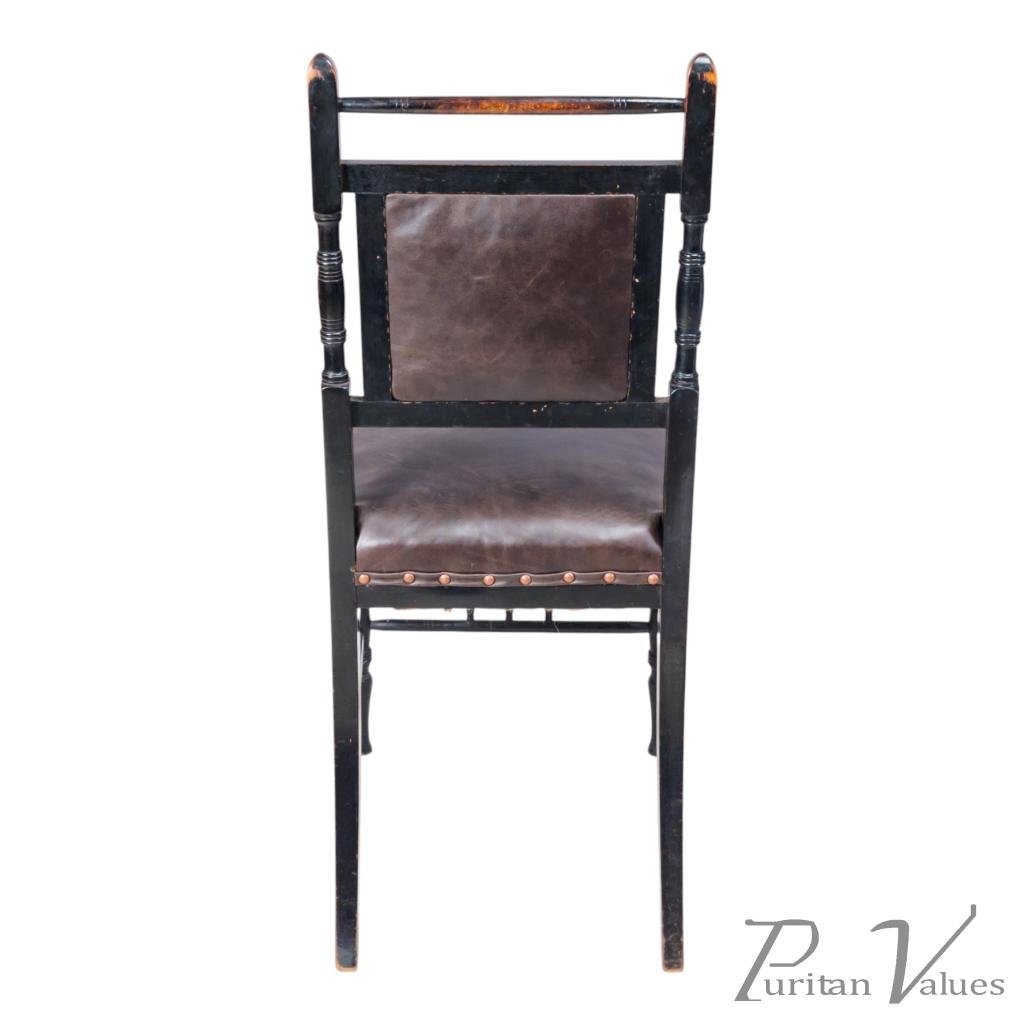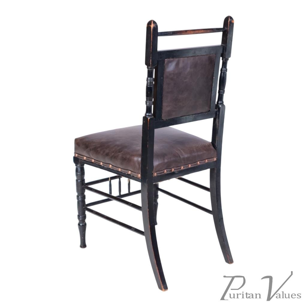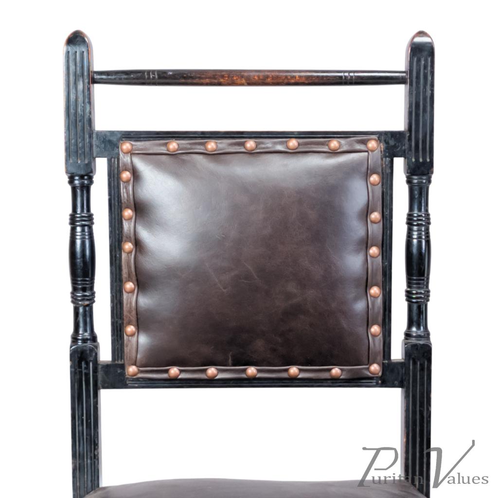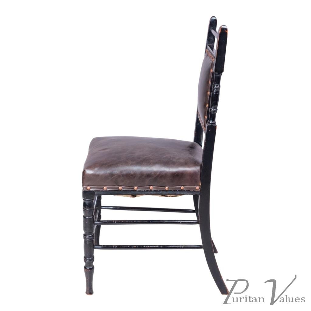 Ebonised walnut side chair attributed to Bruce Talbert for Gillows & Co. c.1880, Aesthetic Movement, with turned details, incised stretchers, and leather upholstery.