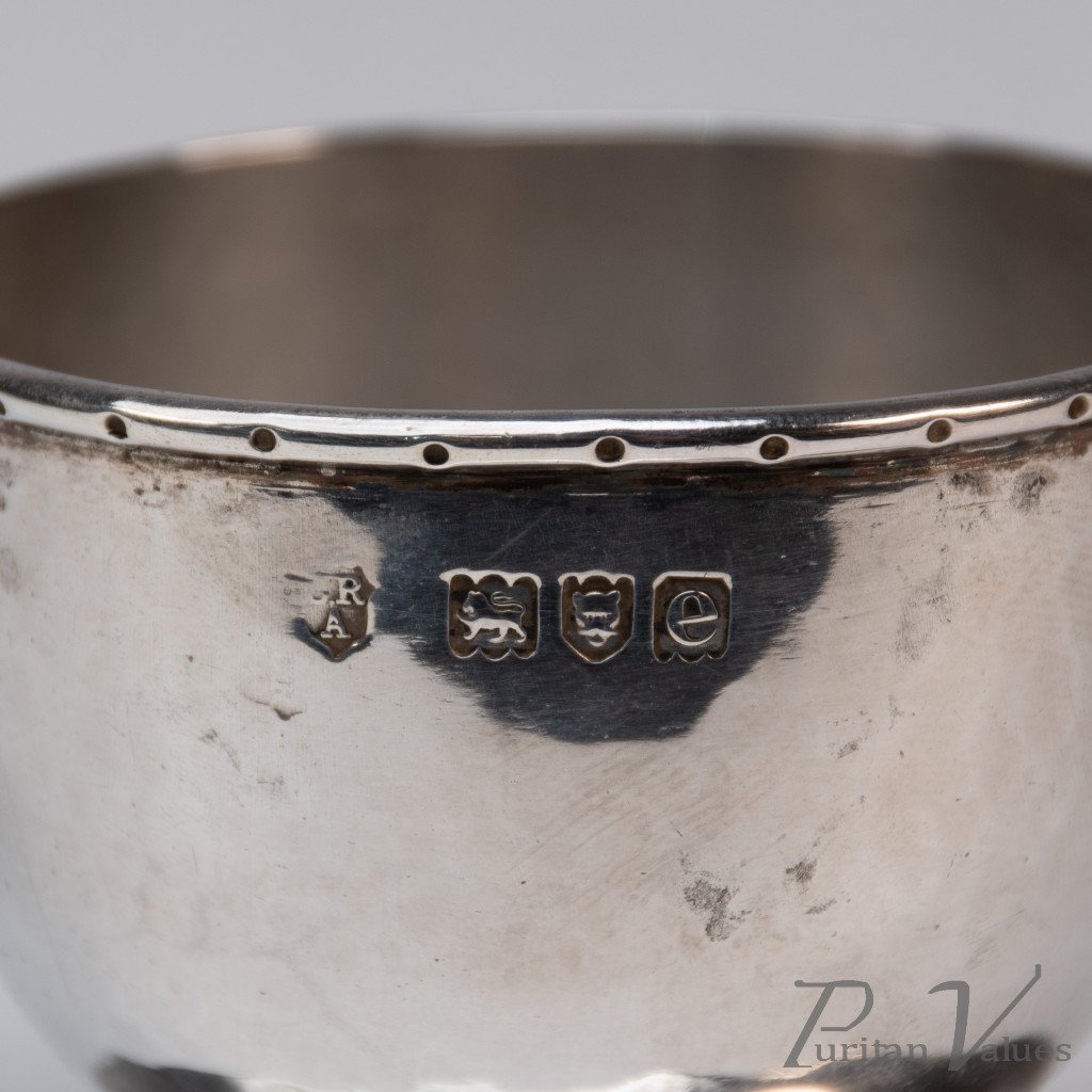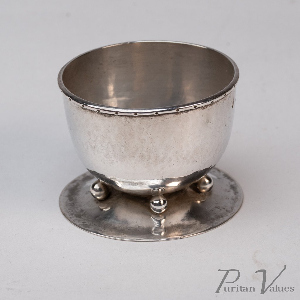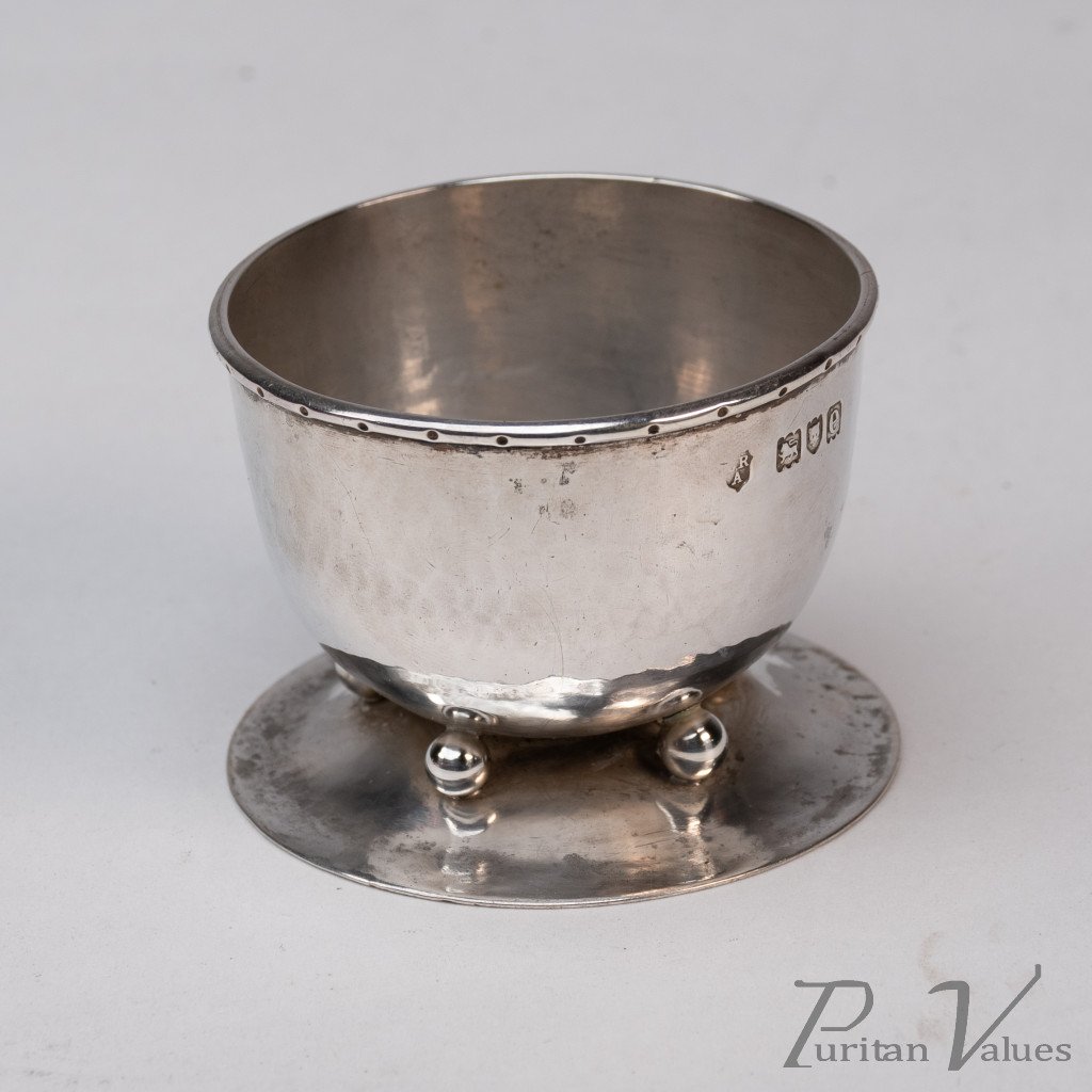 A rare pair of Arts & Crafts silver salt bowls with roll-over rims and dot decoration to the bowl edges stood on four ball feet on a flaring base foot. Priced as a set. Ashbee returned to this ball feet design on many occasions, not just in silverwork but also on many of his furniture designs.