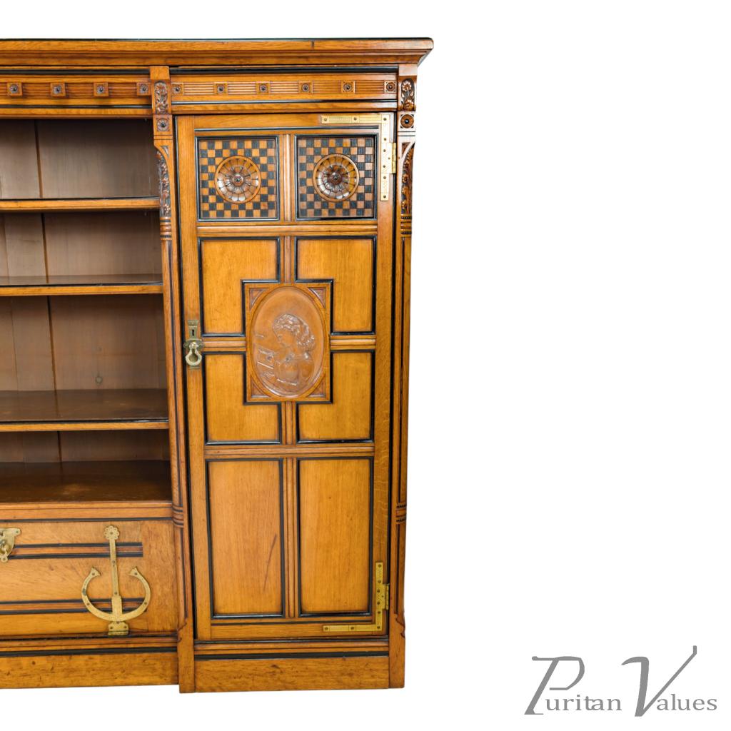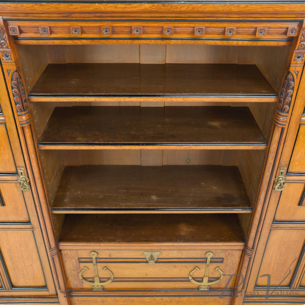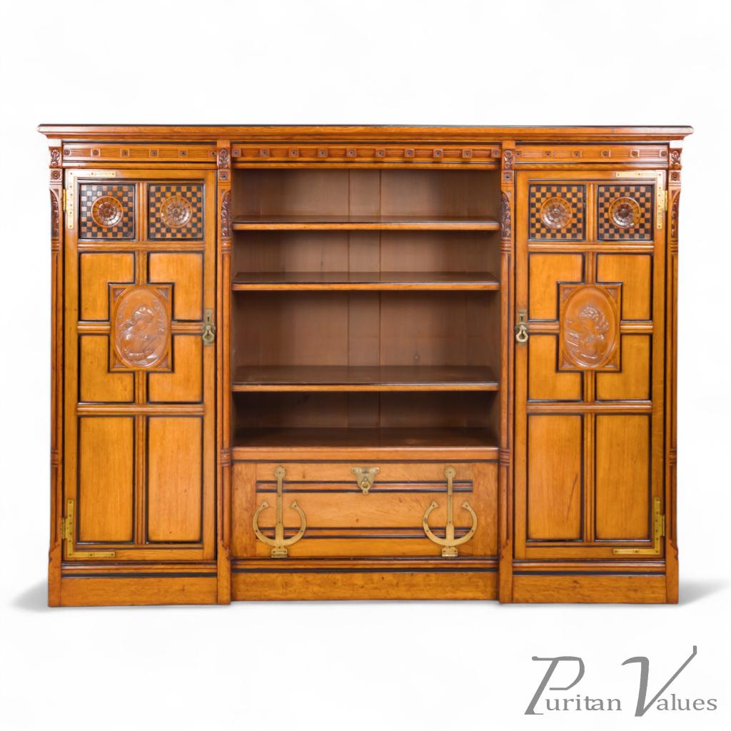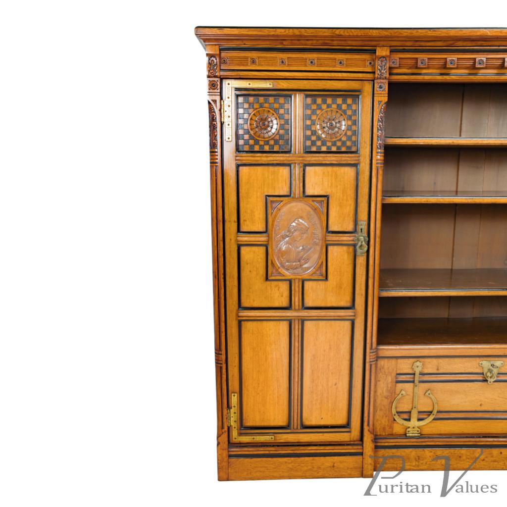 The upper front carries a continuous row of projecting carved rosettes, set above deeply worked carved brackets. Each of the flanking doors is decorated with a pair of carved florets framed within a field of alternating ebonised and plain oak squares that evoke Japanese basket weave. Centrally placed on each door is an oval relief carving of remarkable execution, one portraying a boy reading and the other a girl writing in a journal with a quill, accompanied by a hovering butterfly. The doors open to reveal adjustable shelving, and the central section presents an open bookcase with further adjustable shelves. Below, a drop front cabinet door retains its original decorative brass fittings, which match the gilded brass hinges and plates applied throughout.