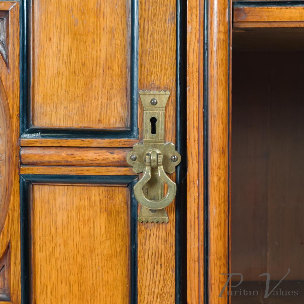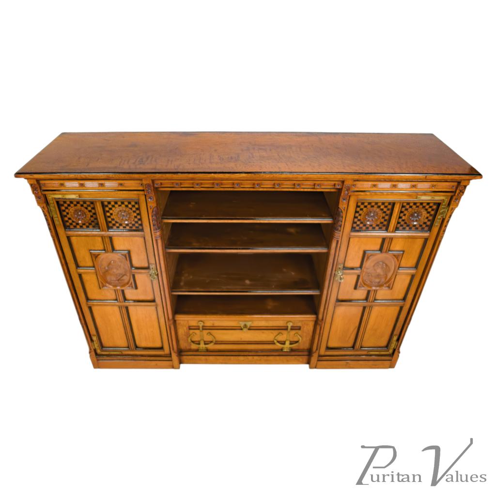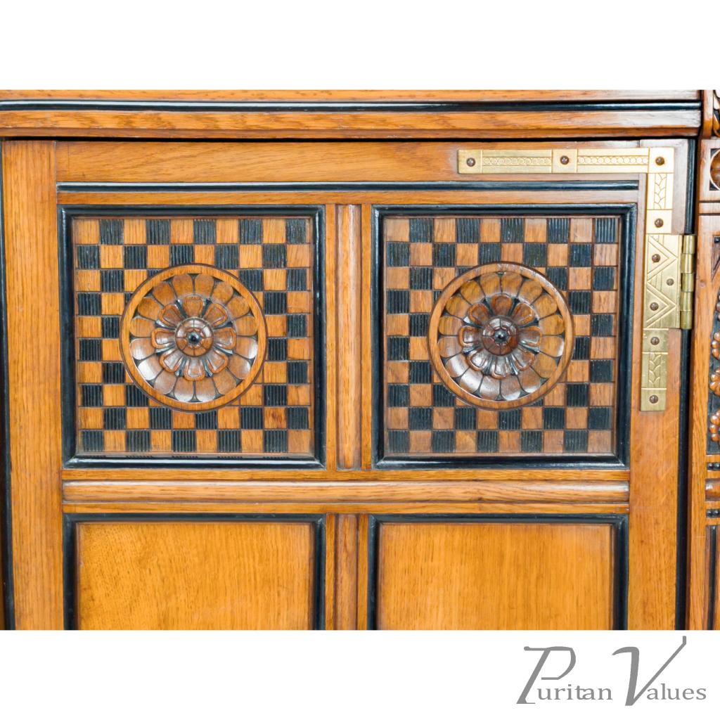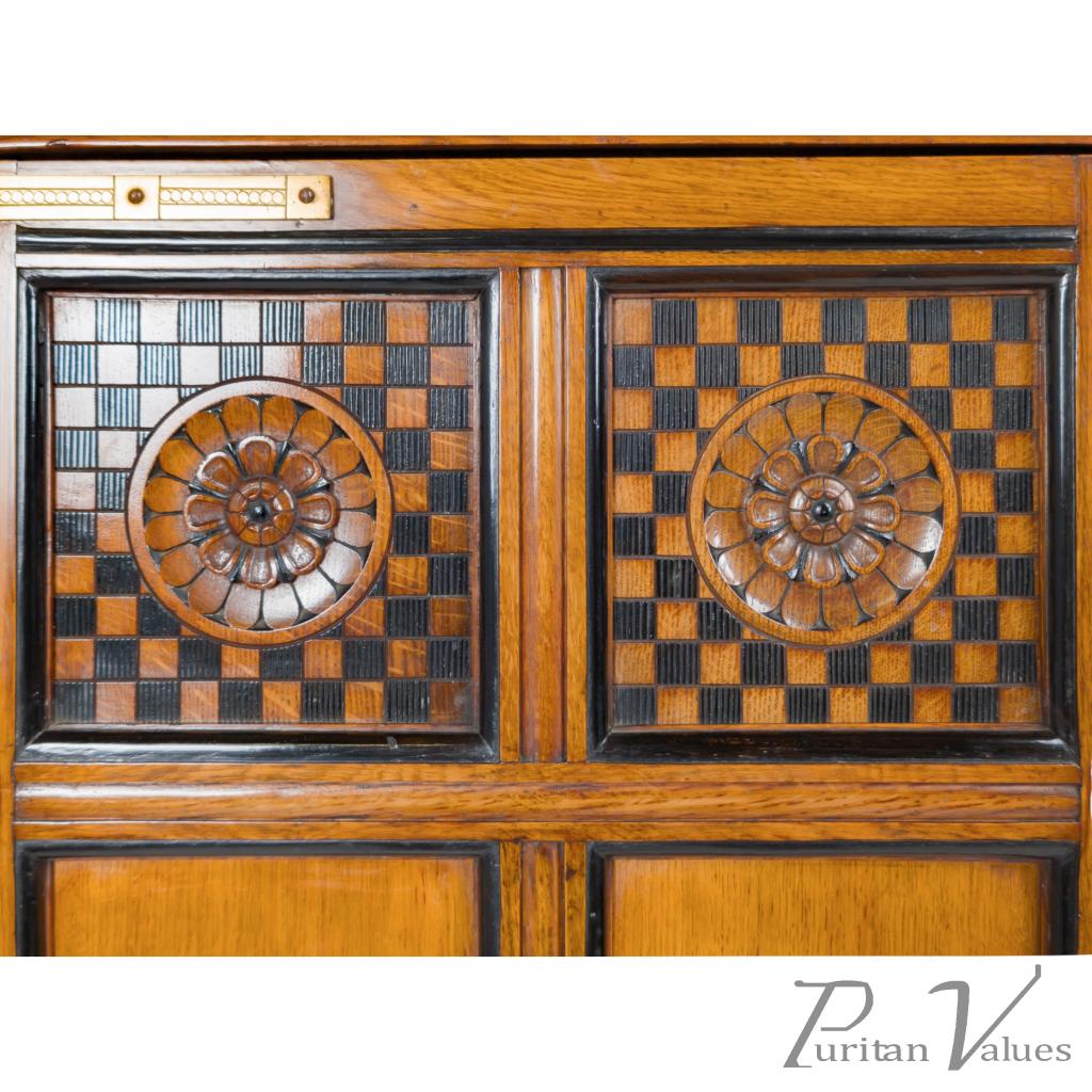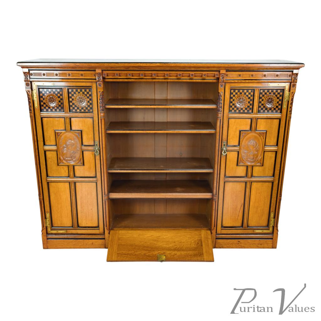 The upper front carries a continuous row of projecting carved rosettes, set above deeply worked carved brackets. Each of the flanking doors is decorated with a pair of carved florets framed within a field of alternating ebonised and plain oak squares that evoke Japanese basket weave. Centrally placed on each door is an oval relief carving of remarkable execution, one portraying a boy reading and the other a girl writing in a journal with a quill, accompanied by a hovering butterfly. The doors open to reveal adjustable shelving, and the central section presents an open bookcase with further adjustable shelves. Below, a drop front cabinet door retains its original decorative brass fittings, which match the gilded brass hinges and plates applied throughout.