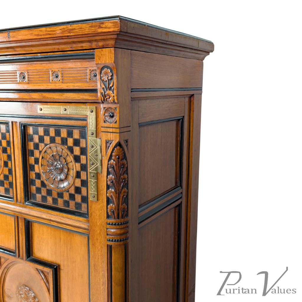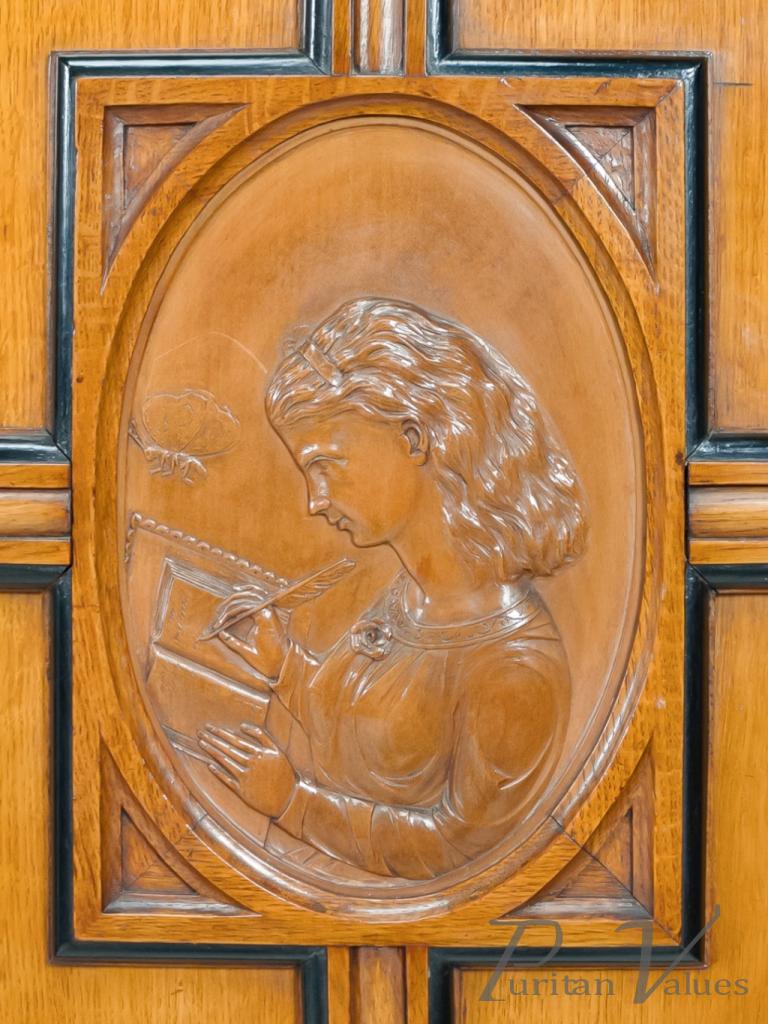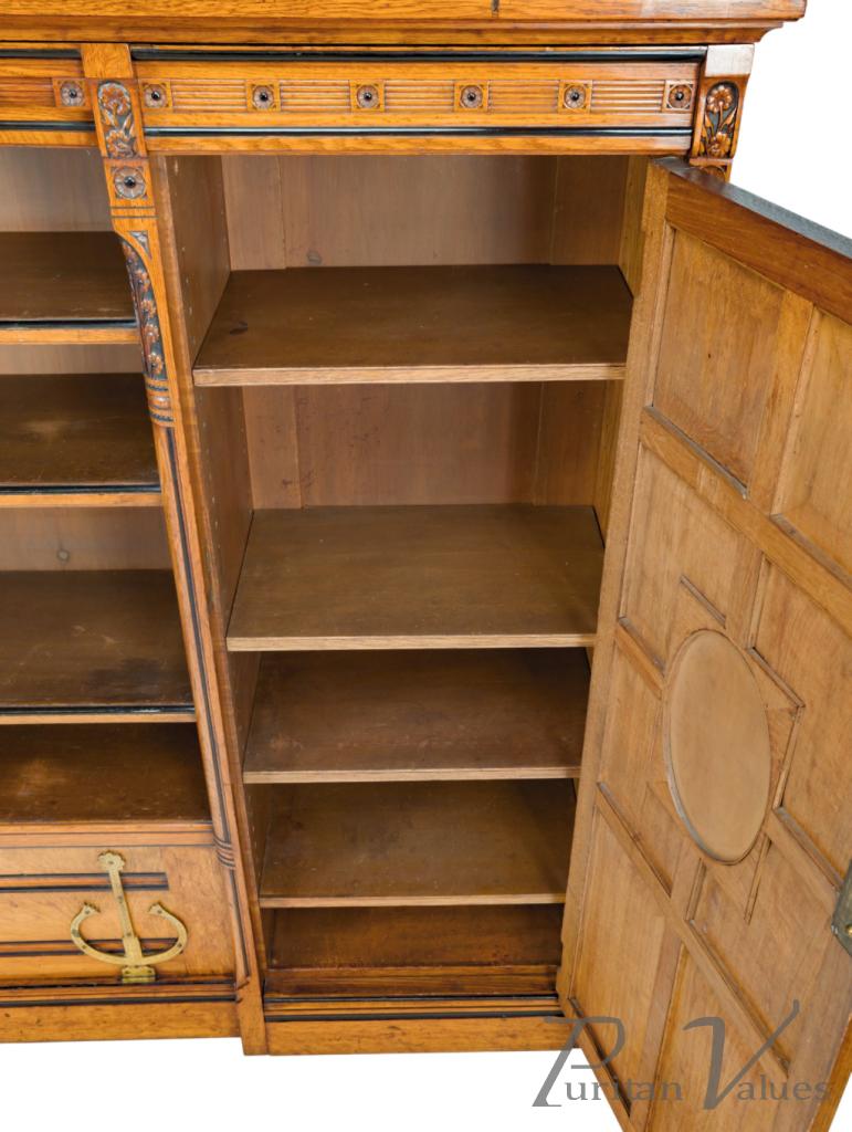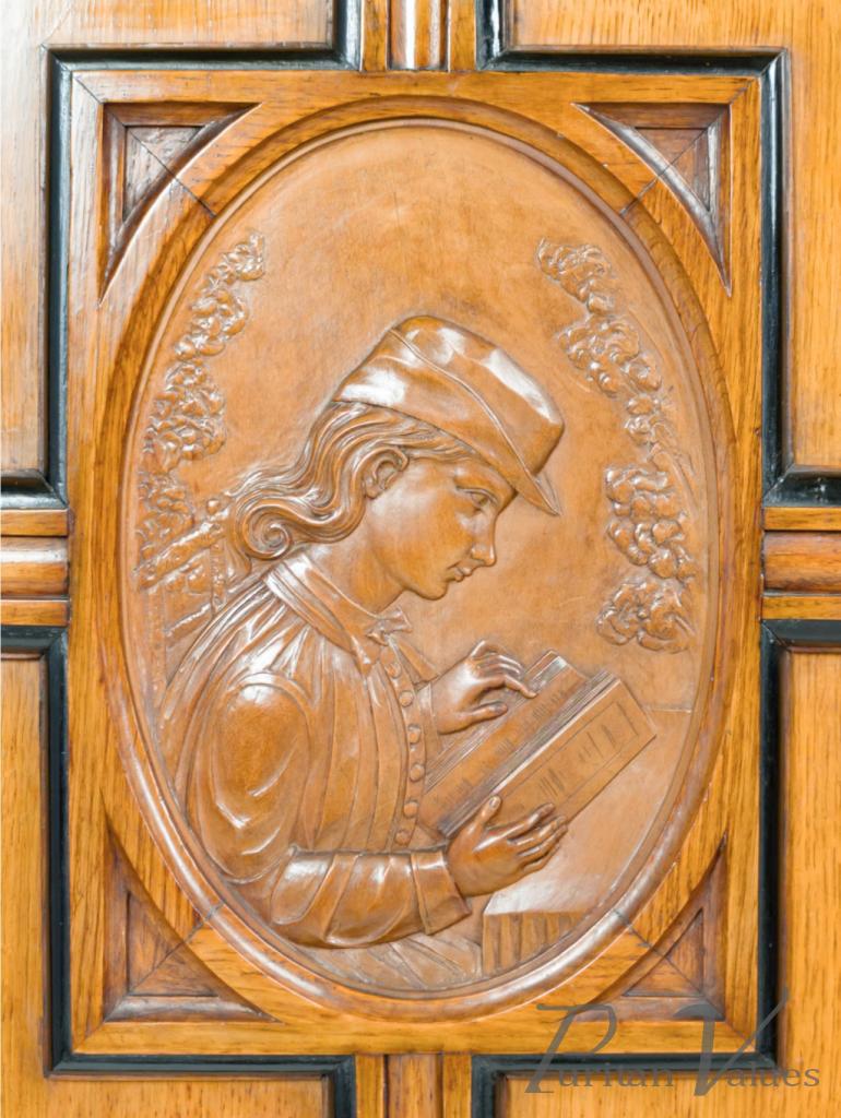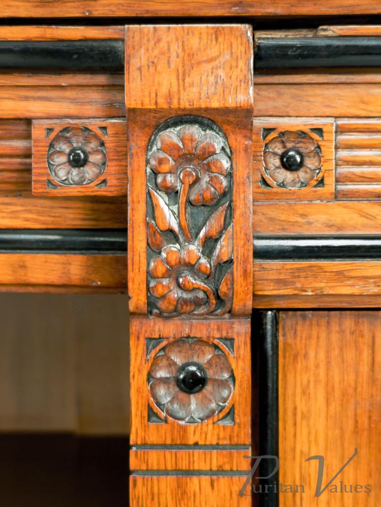 The upper front carries a continuous row of projecting carved rosettes, set above deeply worked carved brackets. Each of the flanking doors is decorated with a pair of carved florets framed within a field of alternating ebonised and plain oak squares that evoke Japanese basket weave. Centrally placed on each door is an oval relief carving of remarkable execution, one portraying a boy reading and the other a girl writing in a journal with a quill, accompanied by a hovering butterfly. The doors open to reveal adjustable shelving, and the central section presents an open bookcase with further adjustable shelves. Below, a drop front cabinet door retains its original decorative brass fittings, which match the gilded brass hinges and plates applied throughout.