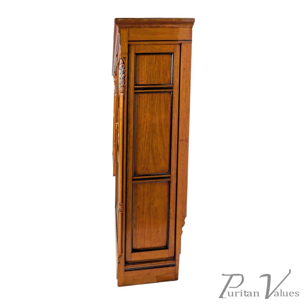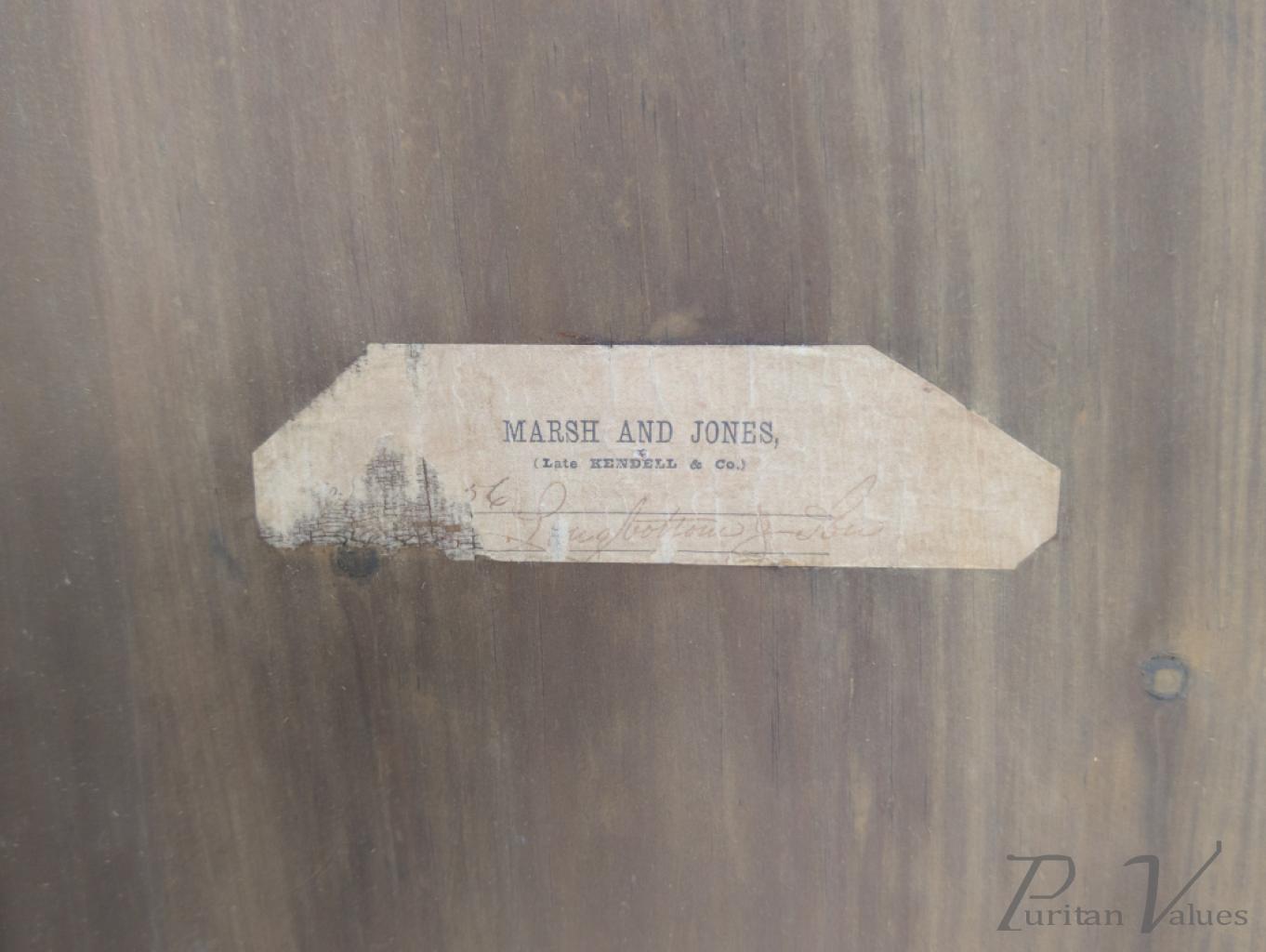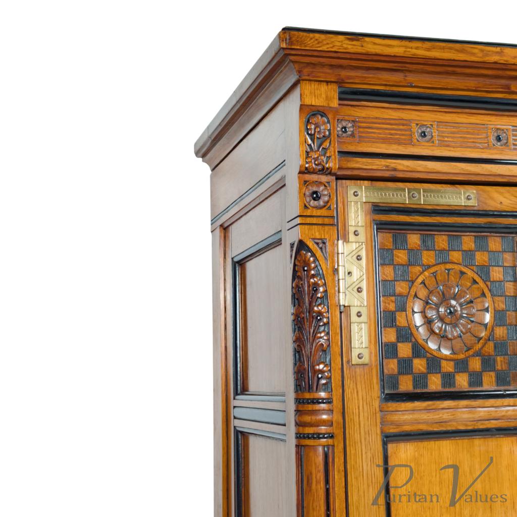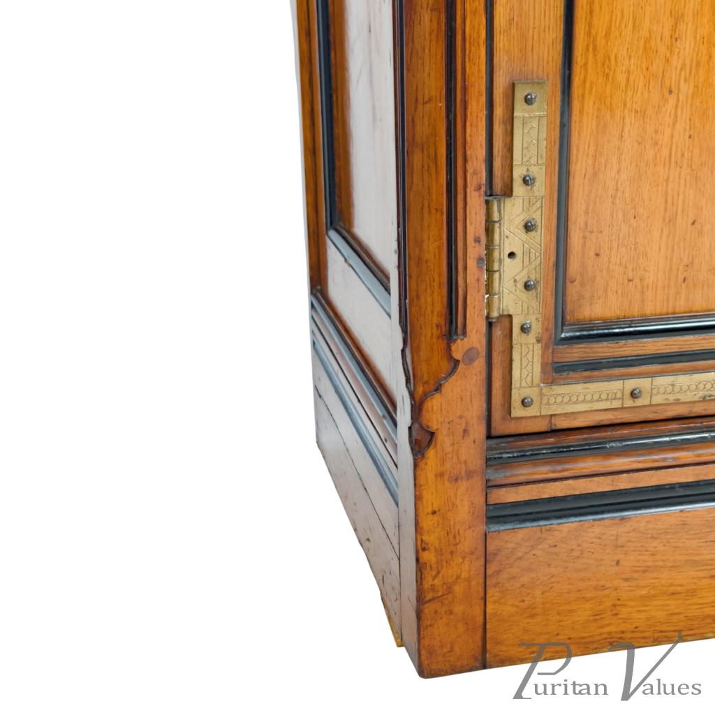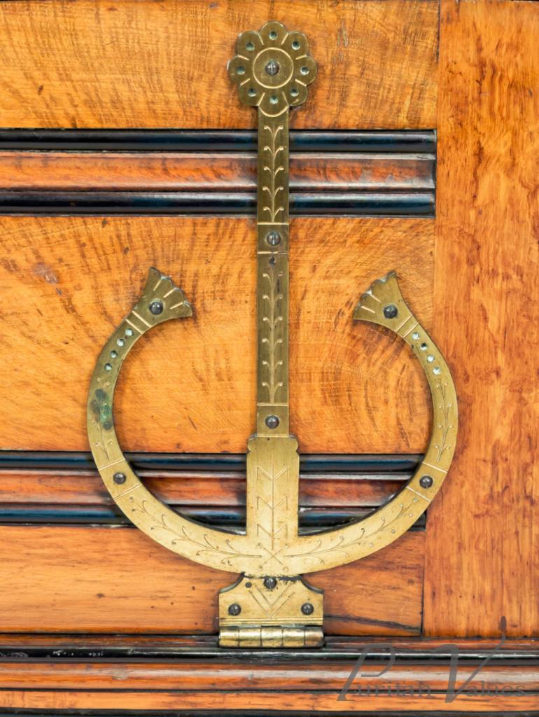 The structure retains the original Marsh and Jones Late Kendal paper label on the reverse. The period, configuration and decorative programme correspond to furniture designed by Bevan for the industrialist Titus Salt junior. Marsh and Jones had already undertaken a major commission for his father, Titus Salt, the founder of Saltaire, supplying furniture for the marriage of Salt’s son in March 1865 and installing it at Baildon Lodge. That group, designed by Bevan, is partially preserved in the collections of Leeds Museums at Lotherton Hall, Yorkshire. A further large commission, executed for Titus Salt junior at Milner Field in 1866, provides a plausible context for this bookcase and reinforces the link between Bevan’s authorship and the firm’s output during this phase.