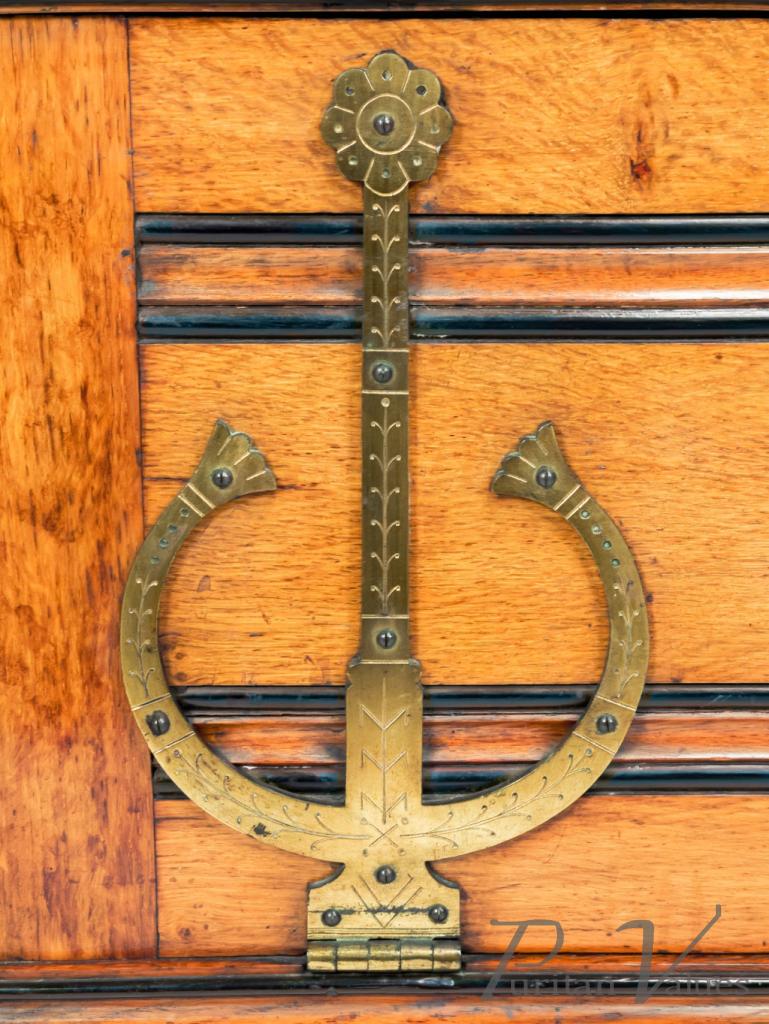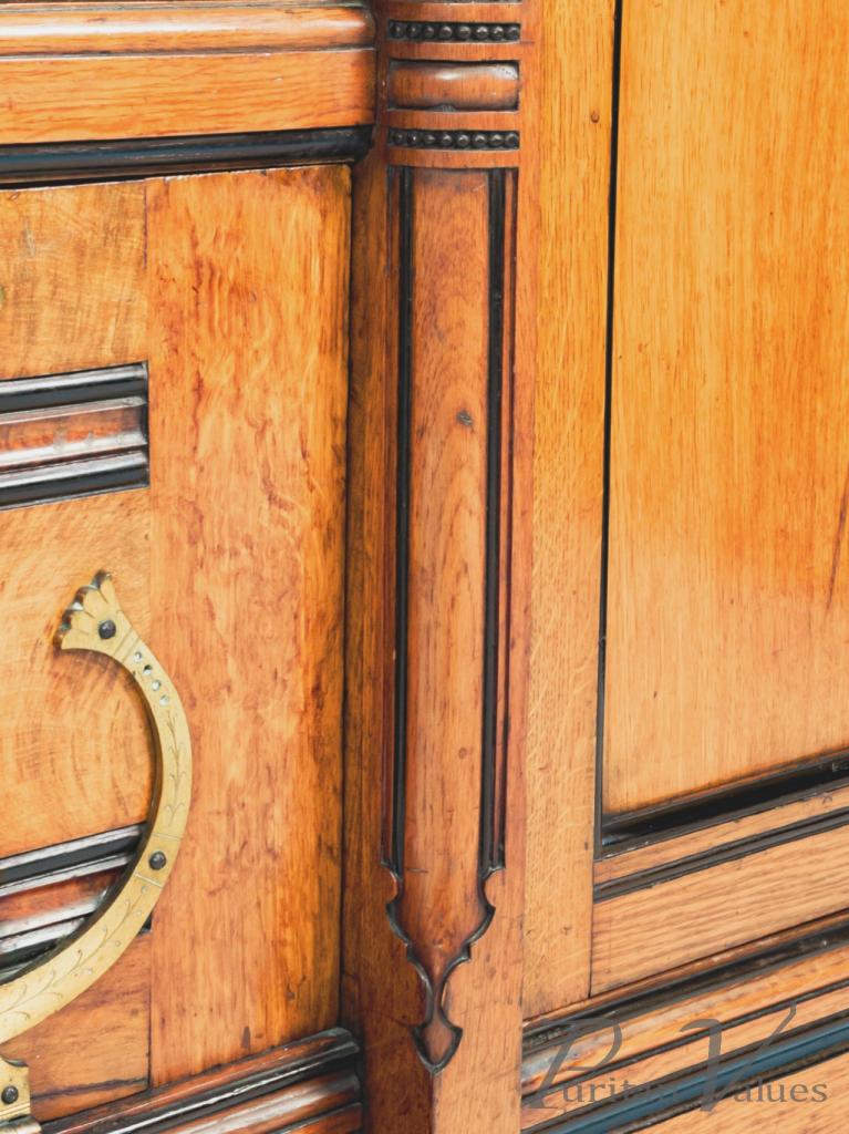 Bevan also permitted Marsh and Jones to produce the newly registered reclining armchair he designed, and an oak davenport inlaid with mixed woods is illustrated in Gere and Whiteway (1993), p. 113. The present bookcase, with its mixture of relief carving, geometric surface patterning and bold Aesthetic vocabulary, fully aligns with Bevan’s established oeuvre for the firm during the mid-1860s.