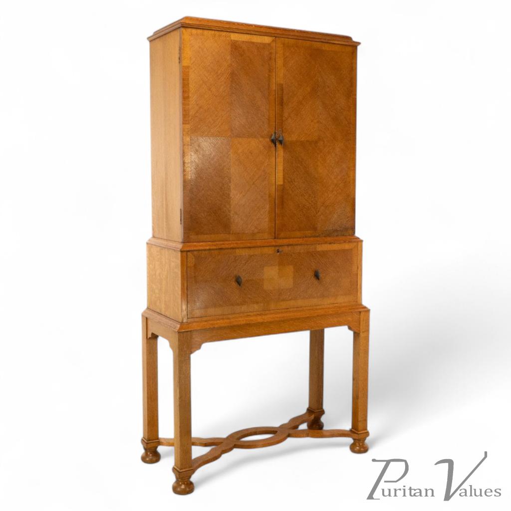 A rare oak secretaire cabinet on stand, with quarter veneered panels to the doors and drawers with black and green diamond-shaped handles. The doors open to reveal adjustable shelves. The sides and lower stand are all made from solid quarter sawn oak with beautiful figuring.