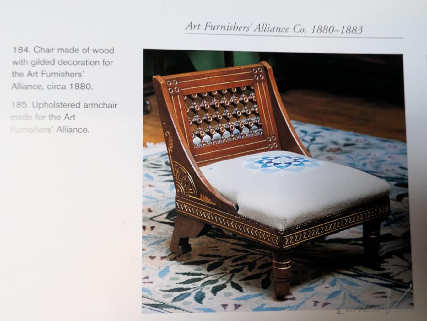 Dresser founded The Art Furniture Alliance in 1880 to supply “whatever is necessary to complete artistic furnishing of a house”, where Dresser was employed as art director. The shareholders were: Harrison (Linthorpe), Chubb, Dixon and Arthur Lazenby Liberty. The furniture AFA produced was made at Chubb’s workshops. AFA went into liquidation in 1883 and their stock was auctioned off. It is most likely that Arthur Liberty, who had 50 shares in AFA, bought much of the stock from the liquidation auction and probably why this early AFA low chair is stamped Liberty & Co Regent St.