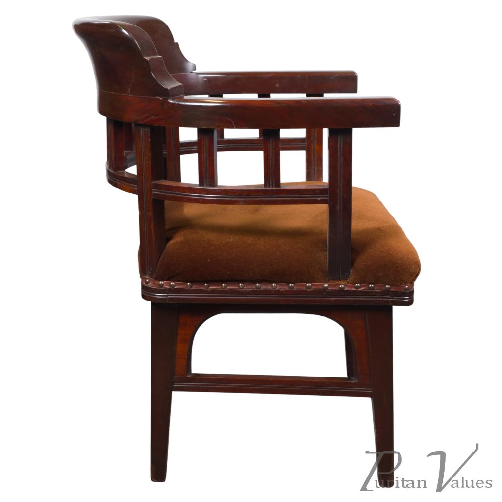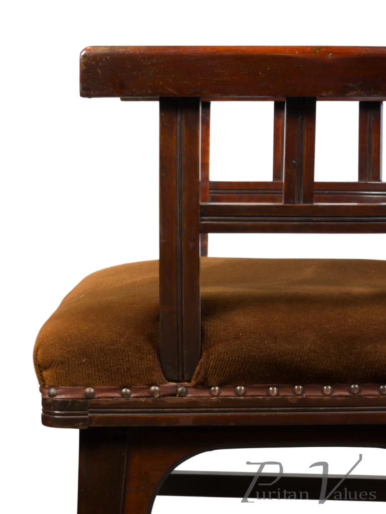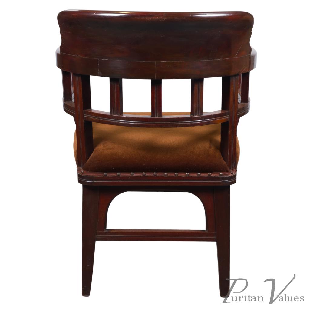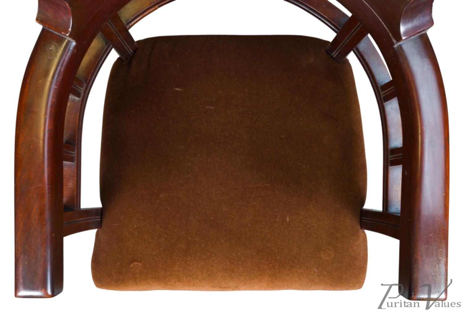 Collinson & Lock, attributed, armchair in mahogany, with velvet seat. Aesthetic Movement (1860–1890), c.1870, English, Victorian. Compact wraparound form intended for desk, library, or occasional seating, with a continuous curved back and broad arms set over incised uprights.