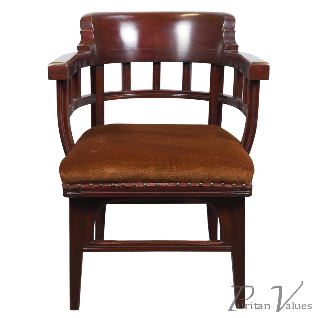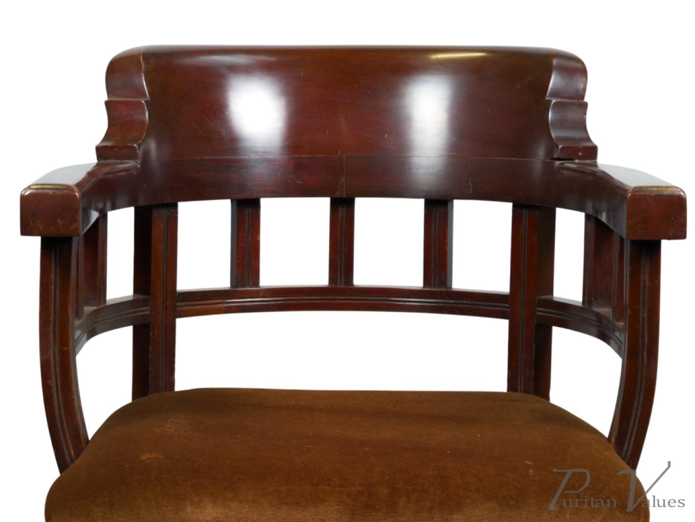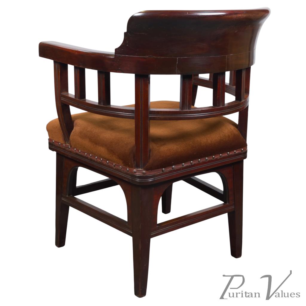 Collinson & Lock, attributed, armchair in mahogany, with velvet seat. Aesthetic Movement (1860–1890), c.1870, English, Victorian. Compact wraparound form intended for desk, library, or occasional seating, with a continuous curved back and broad arms set over incised uprights.