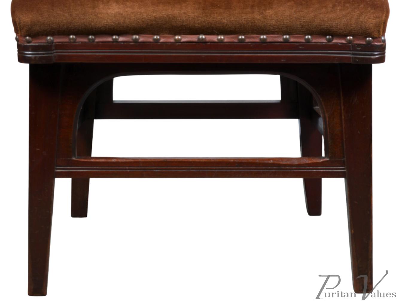 This variant differs from the other we have online, with a single-piece curved back panel with stepped returns and a brown velvet seat finished with a close-set studded border. The seat sits slightly proud to allow for the decorative arched apron sections that meet the low stretchers tying the tapering legs, with subtle incised line detailing, keeping the silhouette light while maintaining a grounded stance.