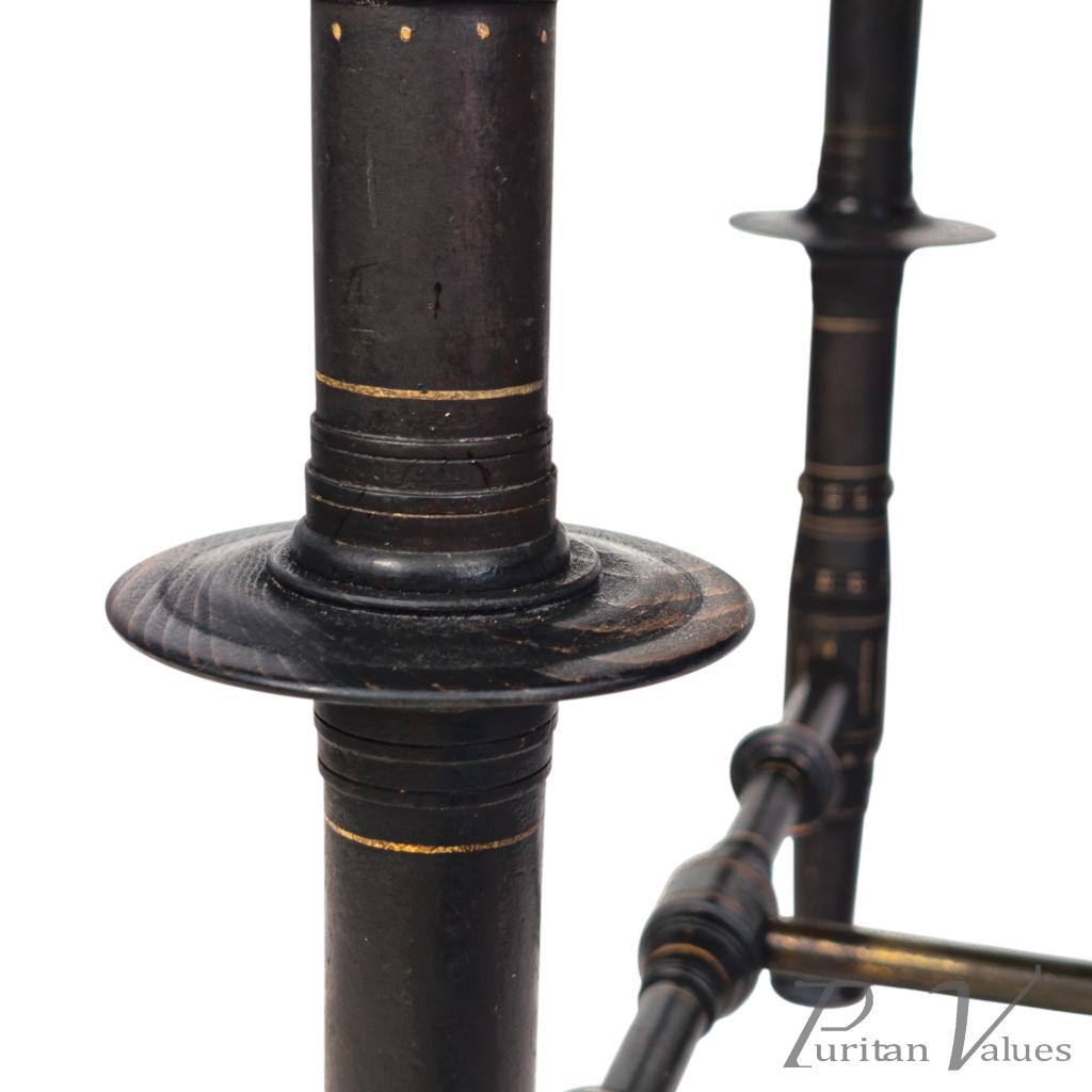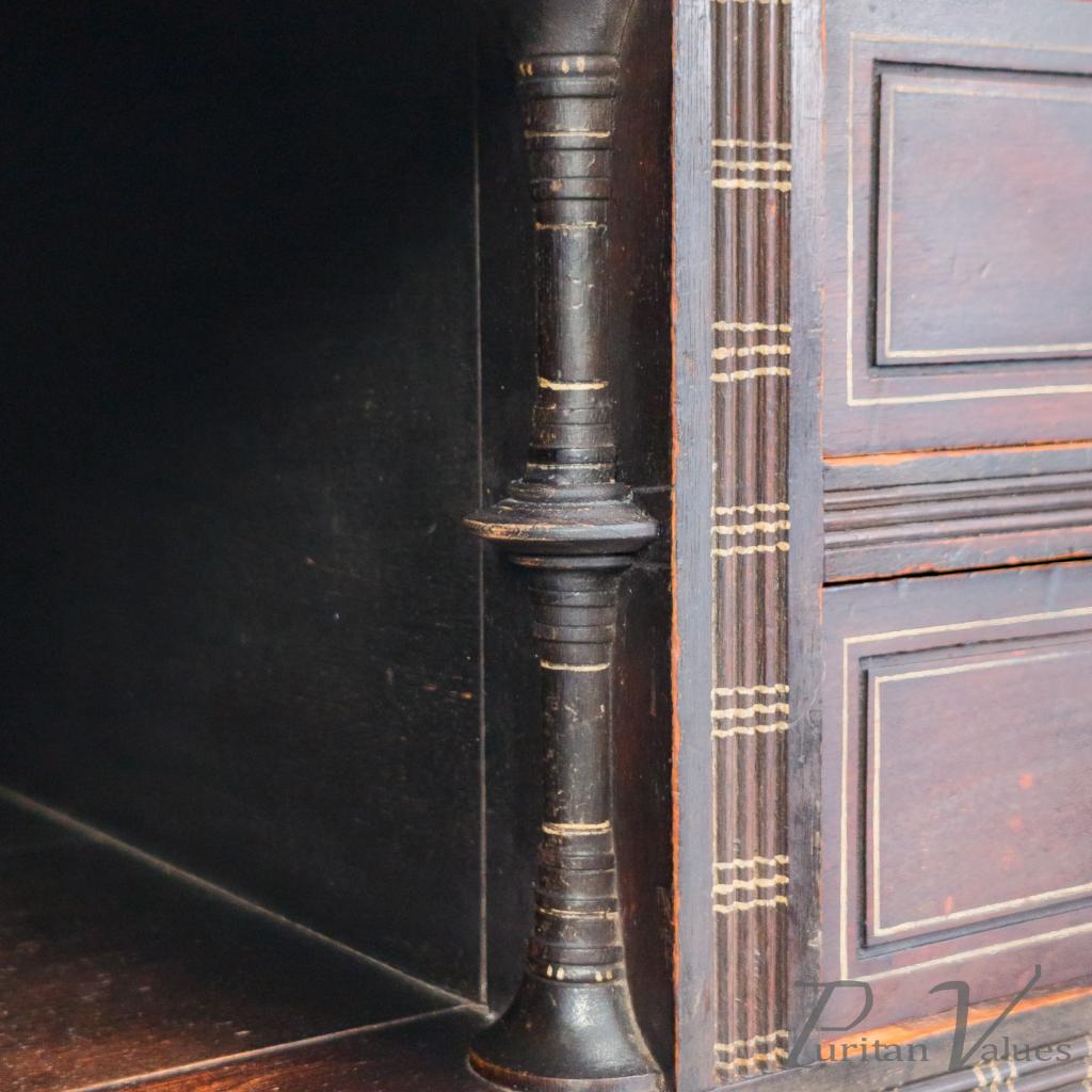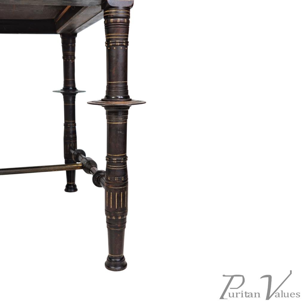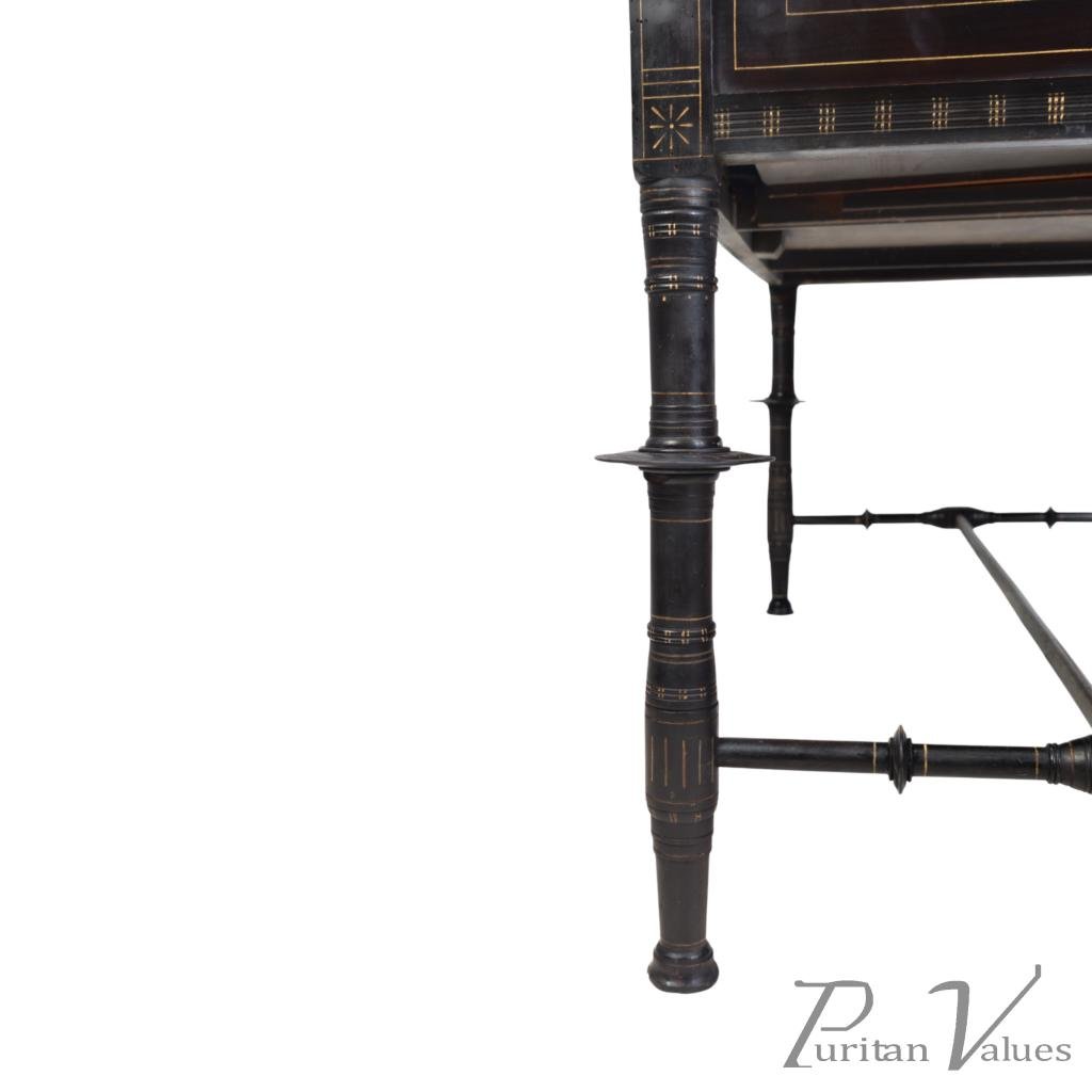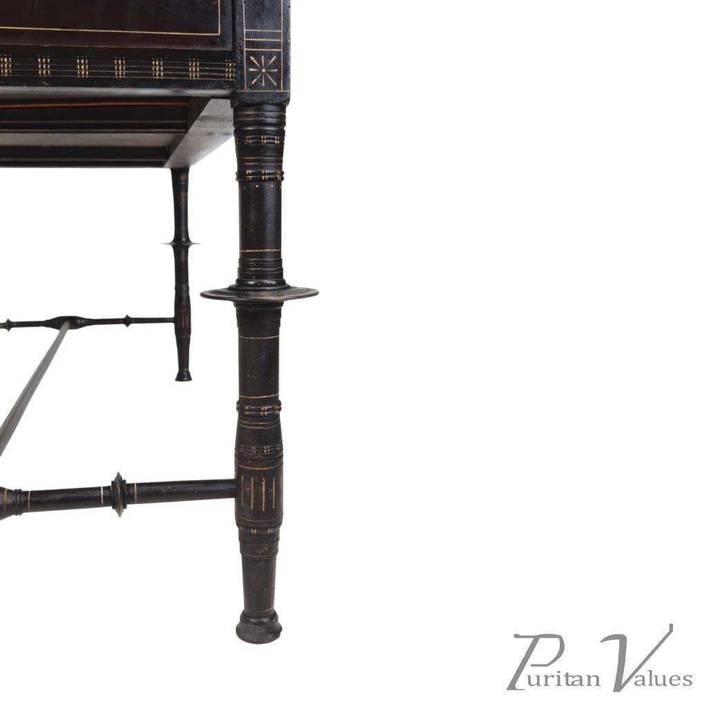 The side cabinet matches a desk clearly from the same suite of furniture that was misattributed to E. W. Godwin and illustrated in Elizabeth Aslin’s early book on Godwin. Its form and decoration, including the unusual attenuated discs and central stretcher made from brass, all correspond exactly.