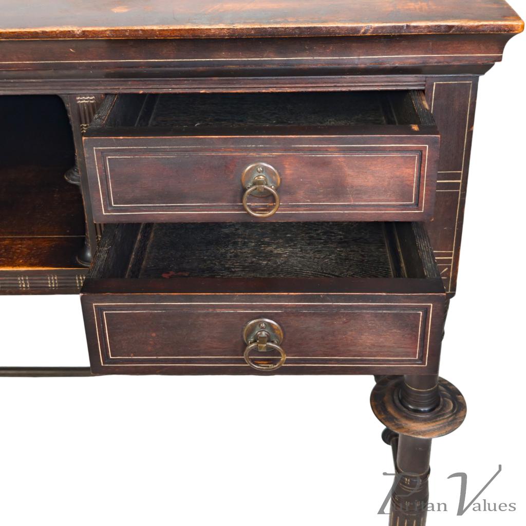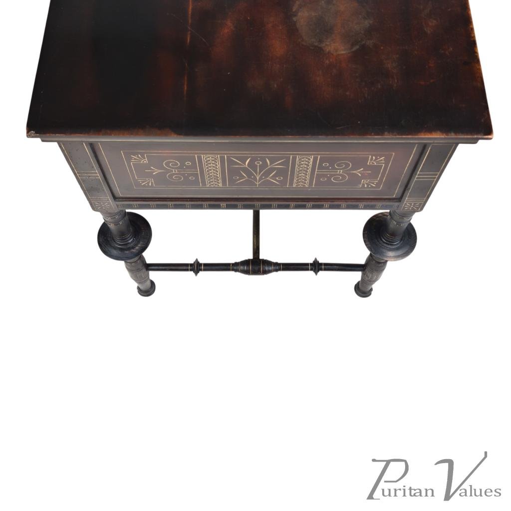 Daniel Cottier, a rare, probably unique Egyptian Revival side cabinet/Desk with a moulded edge and a central turned support below, with conforming half-turned supports to each side in front of an open storage area, flanked by twin drawers to the right and a large deep single drawer to the left, the front of which is designed to look like two drawers, keeping the overall Aesthetic balance of the view from the front. Restrained yet highly stylised hand-painted decoration to the front, sides and back with highlights to the legs and attenuated turned discs. The legs are united by conforming side stretchers that in turn are united by an unusual central stretcher made from brass.