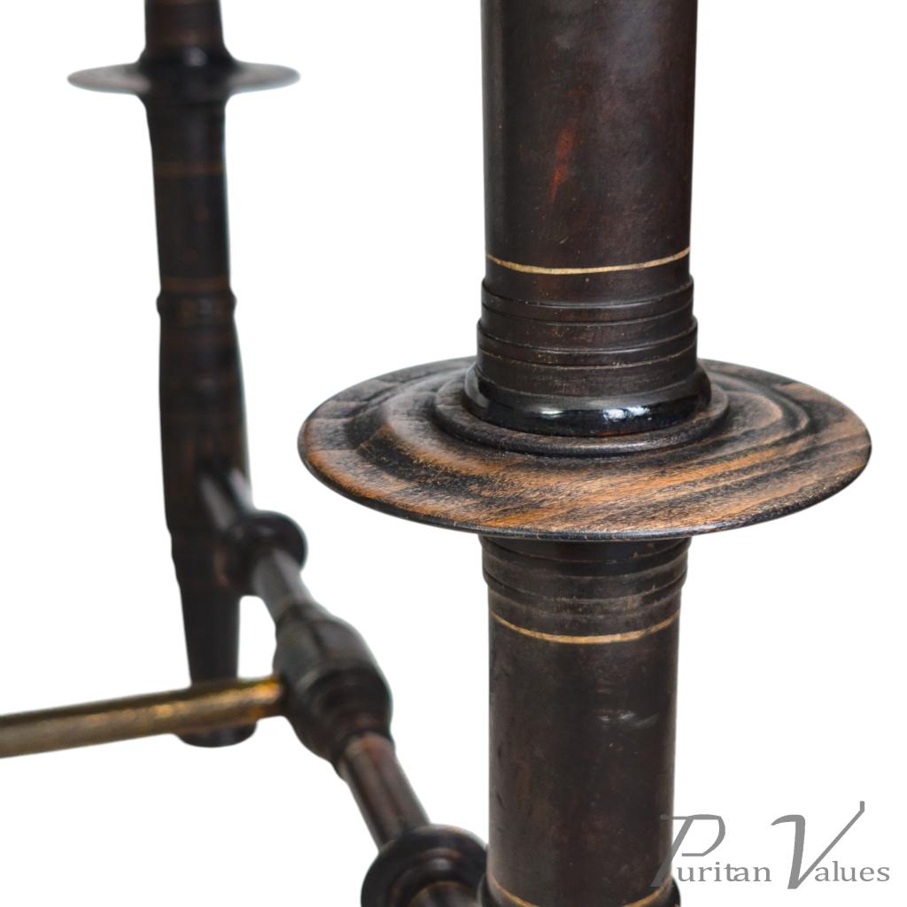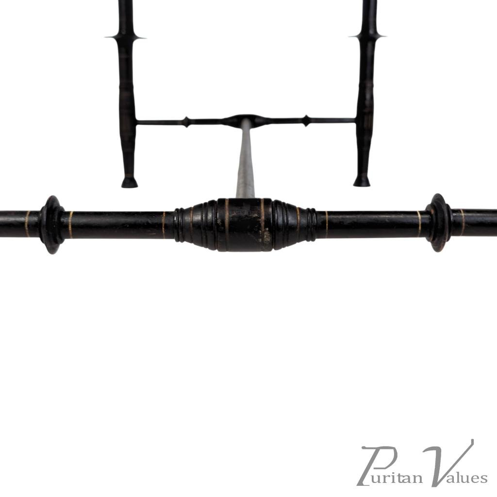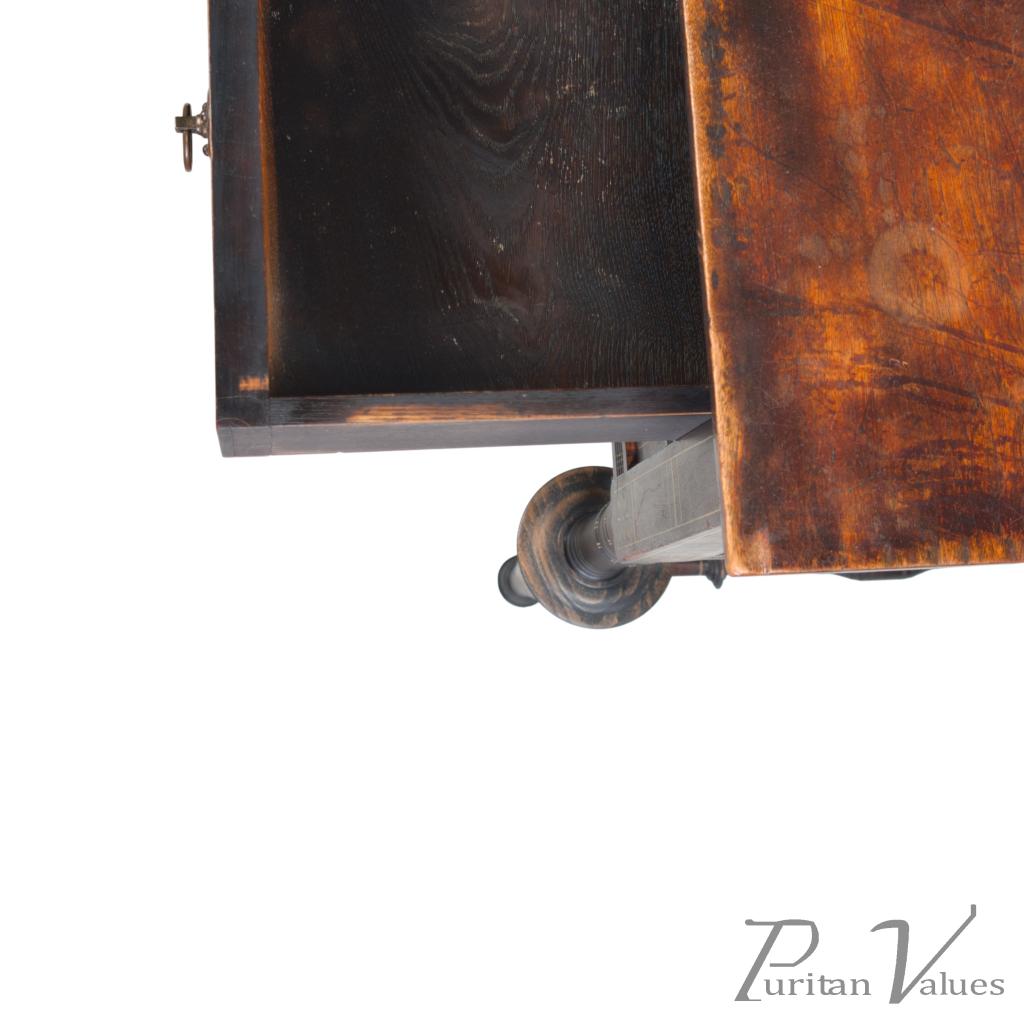 There are direct relationships with the painted decoration of the scrollwork finials decorated to the back and the sides where they share the same curls, including the star decoration to the upper corners. With this side cabinet you can see the painted detail of the sun in its entirety, painted within the square, and cornered by the four little dots, conforming to the sun detail behind the handle on the desk illustrated in Aslin’s book.