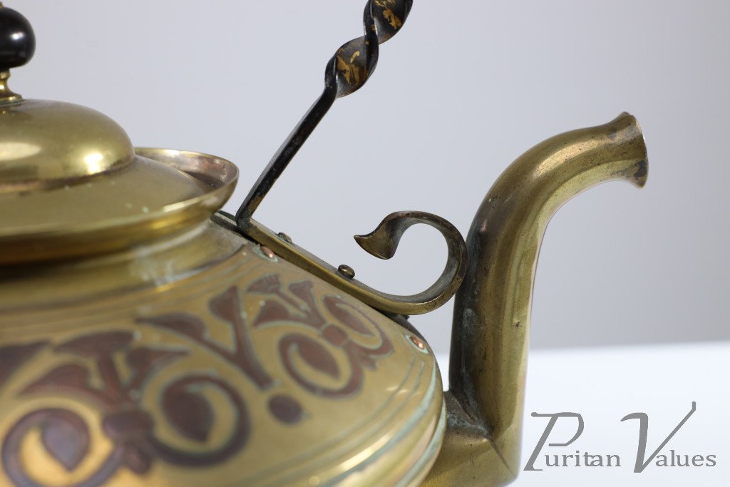 A rare brass and copper teapot with stylised floral decoration, with scroll and twisted supports to the ebonised handle, typical spout form, on circular base.