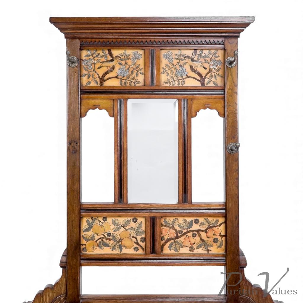 A fine quality Anglo-Japanese oak Hallstand with upper panels depicting songbirds perched in cherry blossoms and a central bevelled mirror, with the lower panels depicting apples and pears.