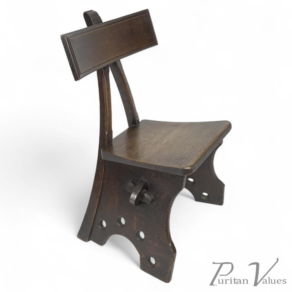 However, by 1876, some of E. W. Pugin's designs were available through Cox & Sons church furnishings company, and later designs of E. W. Pugin's furniture were also manufactured by the London cabinet maker C & R. Light. Variants of this chair design have been discovered, featuring four holes as in this example, instead of five holes on each side with small rounded brass feet at the front, makers C & R. Light or Cox & Sons come to mind.